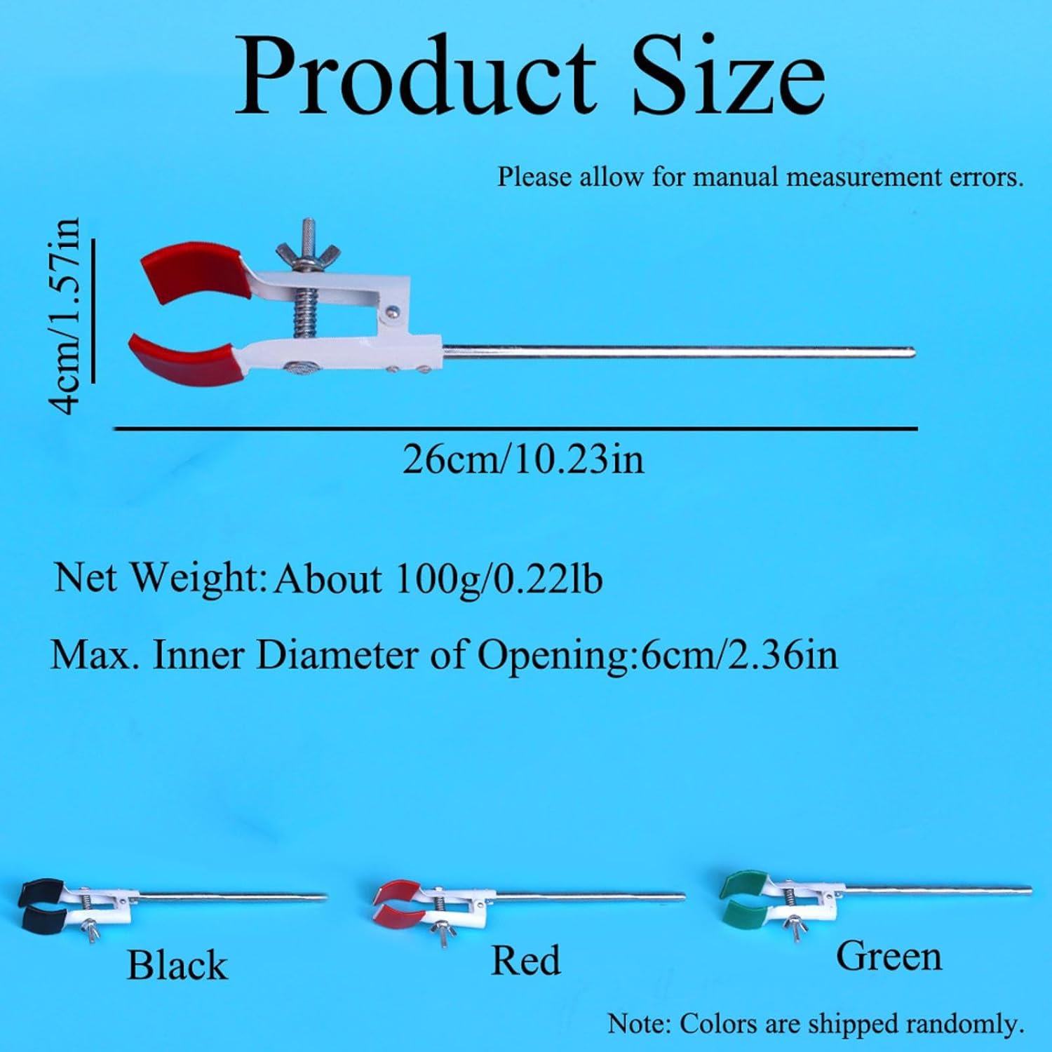 Feature:Hard and Corrosion-ResistantThe clamp is constructed from galvanized iron, which provides a robust protective layer for the underlying metal. This design enhances the hardness and wear resistance of the lab clamp's prong jaws, making them less susceptible to damageEasy to CleanThe surface of the adjustable flask holder, coated with a galvanized layer, is exceptionally smooth, making it resistant to dirt. This feature allows for easy cleaning after each use, helping to maintain a hygienic environment in the laboratoryStable ClampingThe maximum inner diameter of the beaker clamp's opening can reach 6cm/2.36in, allowing it to securely hold various sizes of beakers, test tubes, and other laboratory equipment to accommodate different experimental requirementsLightweight and CompactThe lab clamp prong jaw weighs only approximately 100g/0.22lb and measures 26cm/10.23in in length. Its overall lightweight design reduces wrist strain during use, making it easier to conduct experiments. Additionally, the compact design of this universal lab clip facilitates convenient storage, occupying minimal space and simplifying daily management and maintenance in the laboratoryWide ApplicationsThe adjustable flask holder is not only suitable for securing beakers in various chemical experiments but also has applications in many fields, such as drug testing, making it an important auxiliary tool in the laboratorySpecification:Material: Galvanized IronColor (Random Delivery): Red, Green, BlackSize: 26*4cm/10.23*1.57inMax. Inner Diameter of Opening: 6cm/2.36inNet Weight: About 100g/0.22lbNote: Please allow manual measurement error.Package Included:6 * Lab Clamp Prong Jaw