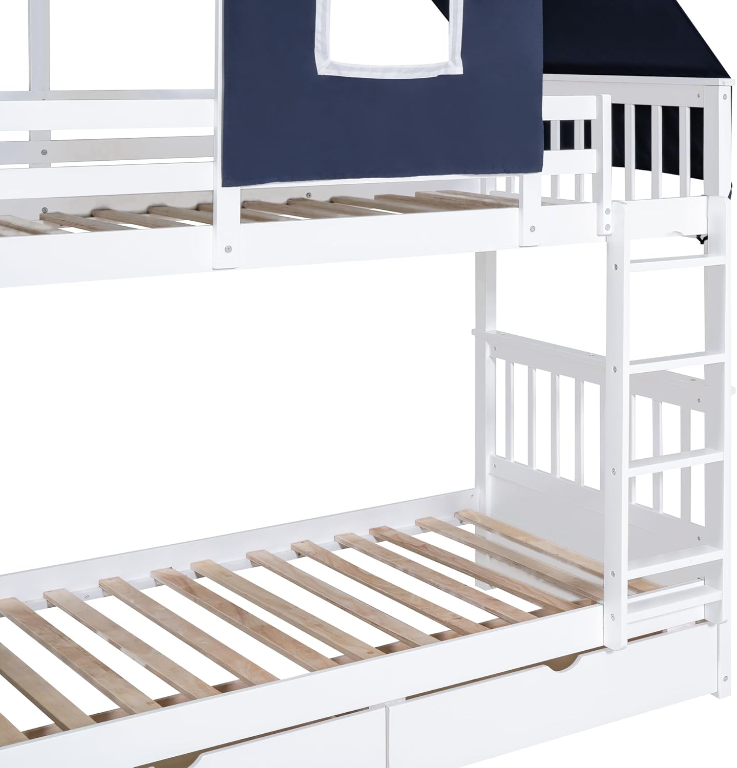 The opportunities are endless to create a fun play environment for your kids, They will look forward to bedtime,reading time.This unique design bed not only saves space, but creates an exciting atmosphere for you. Enjoy this bed for years to come with its durable build, manufactured with quality pinewood to withstand horseplay, scratching and other untimely wear. Comes complete with thick slats to preserve the life of your mattress. Weight & Dimension Overall Product Dimension: 78.3"L x 41.6"W x 90.9"H Number of Package: 2 Overall Product Weight:179.8 LBS Weight Capacity Upper bed: 400LBS Bottom bed: 400LBS Recommended Mattress Thickness Upper bed: 4-6" Bottom bed: 6'' Recommended age Over 6 year-old Specifications Product Type:Bunk Bed Size Twin over Twin Color: White+Blue Tent/Gray+Blue Tent/White+Pink Tent/Gray+Pink Tent Product material Plywood+MDF+Pinewood Bed slat material Plywood Country of Origin Vietnam Notes: Manual measurement has been used,there may be some reasonable error. All the pictures are taken by actual samples, slight chromatic aberration may occur due to lighting or display.