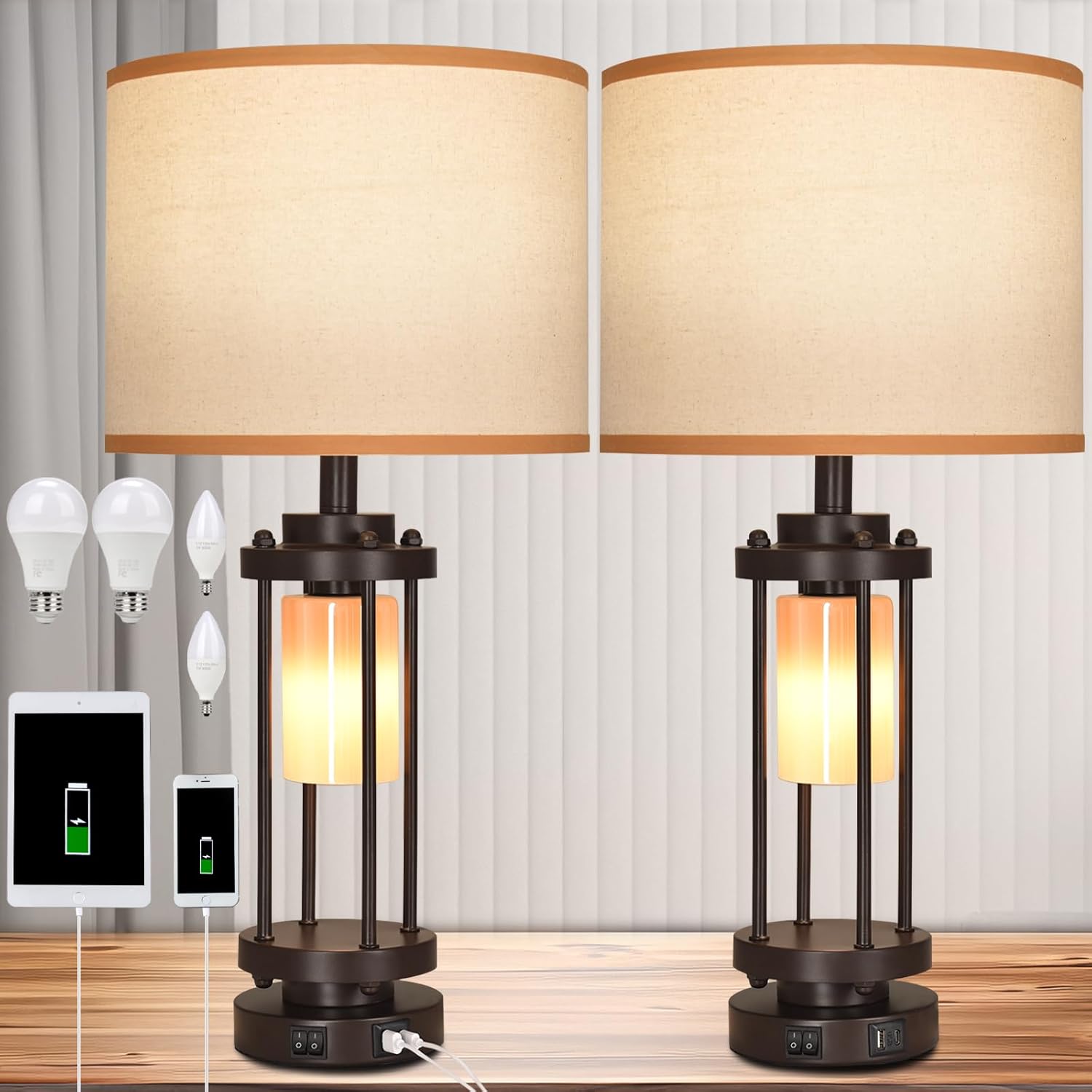 Set of 2 Farmhouse Table Lamps for Living Room, Rustic Lamp for Bedroom Nightstands, Bedside Lamps with USB C + USB A Charge Ports, Industrial Night Light for End Table Entryway, 4 Bulbs Included