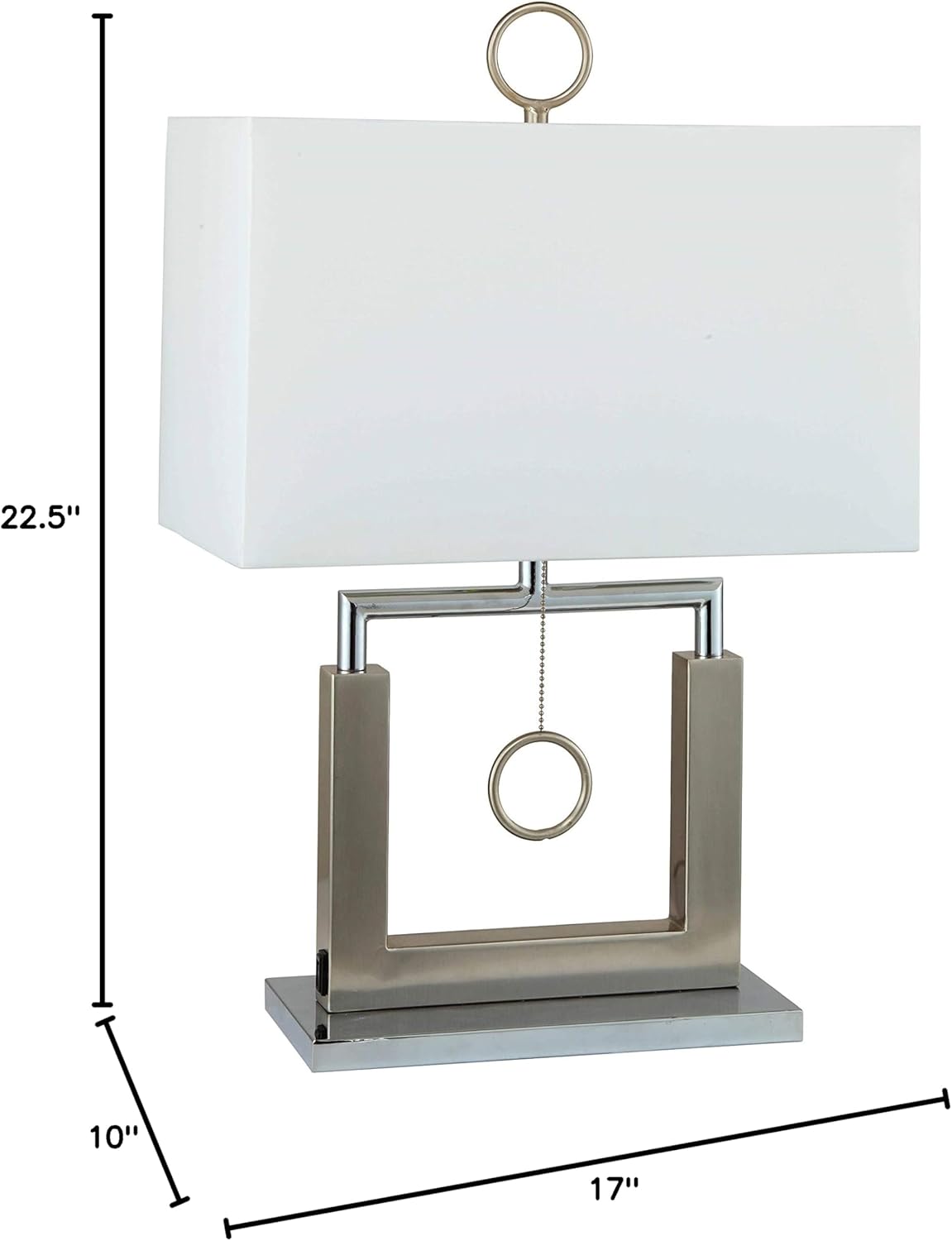 SH Lighting 22.5"H Square Brushed Steel Table Lamp with White Fabric Rectangular Shade. A table lamp with a beautifully soft light throw. Square doughnut shaped base with pull chain switch. Topped by a rectangular white fabric shade.