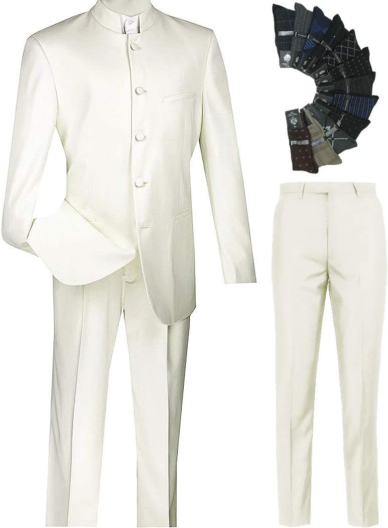 This is a sharp, luxurious-feeling, all-season men's banded-collar suit that any man can look great in. It's fully lined and imported, featuring a banded collar, side vents, two front welt pockets, and a five-button closure with four-button cuffs. The suit includes a fully lined jacket and single pleated front, with partially lined pants and an unfinished hem. Jacket sizing is indicated by a number and a letter, with 'S' for 5'7" and under, 'R' for 5'8"-5'11", and 'L' for 6' and up. It has a regular fit and is dry clean only, with a polyester shell and lining.
