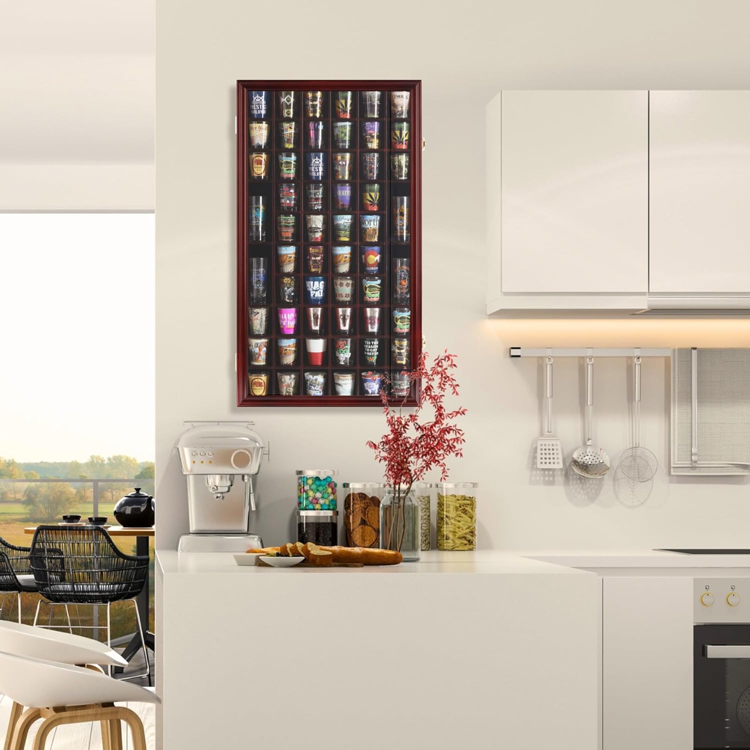 Holds 56 shot glasses and shooter in total: with 56 slots for regular size shot glasses and 4 slots for tall/shooter shot glasses or just regular as well. This would be a excellent gift for shot glass collectors. A great way to display Shot Glass collections. Made from hand selected fine quality hardwood by our experienced craftsmen. Surface is sanded repeatedly to make it smooth and elegant. Matted background to create a lovely display. Brass hinges and door latches. Wall brackets to hang (wall mounted). UV protection acrylic door cover to protect from dust and damage. Overall Measurements: 29.75"H X 16.6"W X 3.5"D. Measurements for Small Slots: 2.5"H X 2.25"W X 2.25"D, Tall Slots: 5"H X 2.25"W X 2.25"D. Please measure your shot glasses before buying.