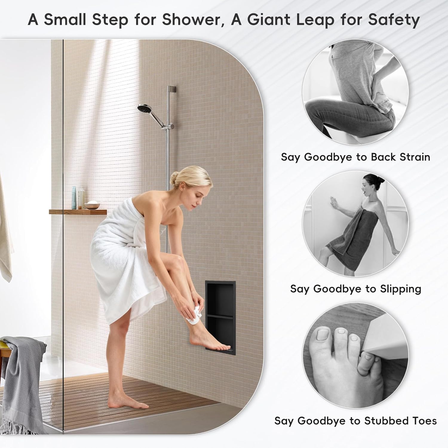 Foot Rest Shower This recessed shower niche can be installed at your preferred height to reduce back strain and improve posture.