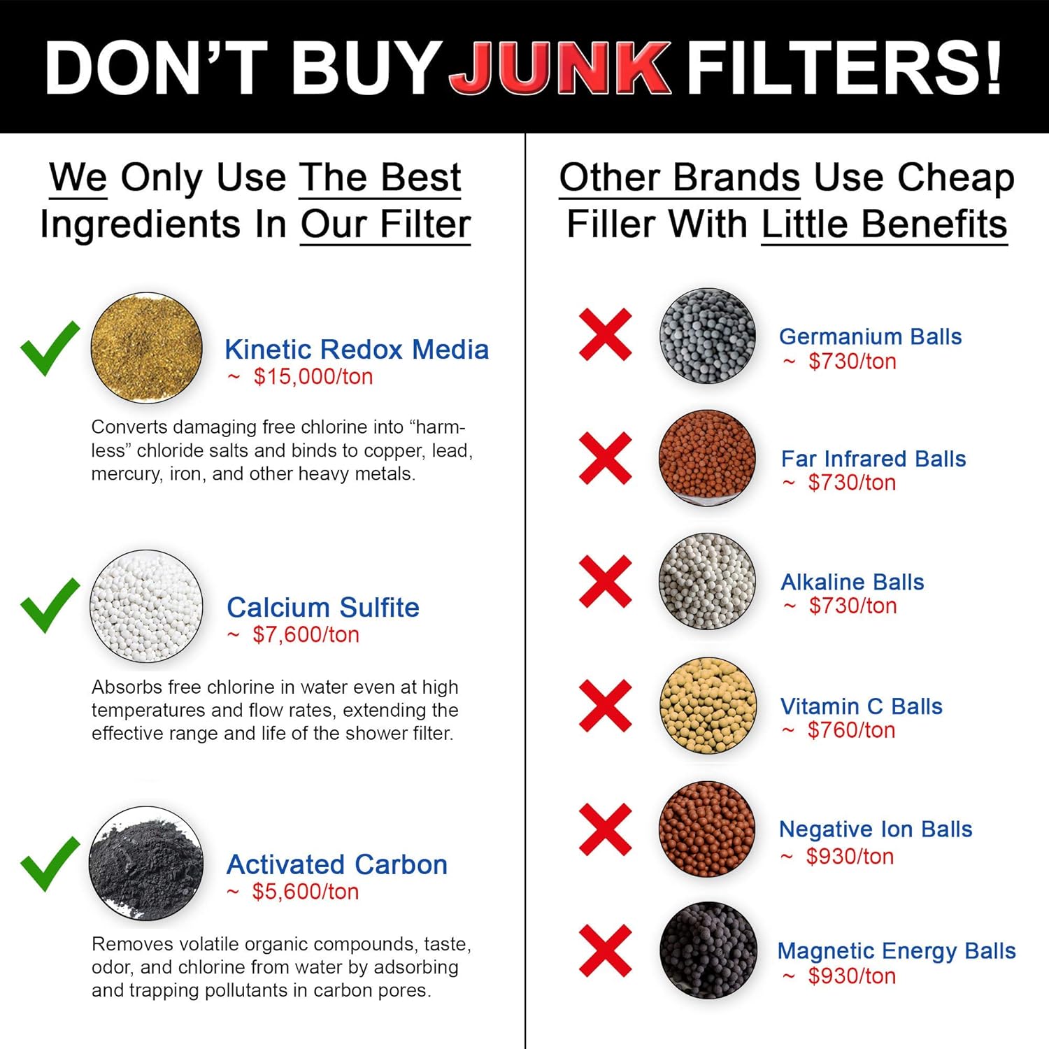 Donโt be fooled by shower filters that advertise "extra stages". These filters use cheap filler material with little benefits. Our shower filters only use ingredients proven to remove harmful chemicals. We combine kinetic redox material, calcium sulfite, and activated carbon into a unique blend that specializes in removing free chlorine, heavy metals, and other toxic yuck in your water supply. You will immediately notice how much softer the water feels. Take a deep breath since the shower no longer wreaks of chlorine. You can now smell the lovely scents of your soap and shampoo. Health experts recommend using a shower filter to remove the chlorine and heavy metals that damage your skin. Just knowing the filter is taking out the chlorine is comforting. And you can feel the difference. We engineered our filter cartridges to be 40% bigger than most showerhead filters. What this means is that you can enjoy our filter for longer than other filters. What this really means to you is more time loving your healthy, strong hair and keeping your skin feeling fresh & not dry. Our mission is to have you enjoy a cleaner shower right away. That is why we made our premium shower filter super easy to install, and we designed the fitting to work with all shower types - including fixed, rain, and handheld. We have clear, step-by-step instructions with pictures to guide you through the 2-minute installation. To make it even more convenient for you, we created this bundle to include: - One (1) extra replacement cartridge. We believe a shower filter should deliver on the promises it makes. Our luxury dechlorinating showerfilter delivers results and leaves you feeling 100% thrilled with your healthier skin, hair, and nails. We are real people who use our own products every day. We expect the best for our family and want the same for yours.