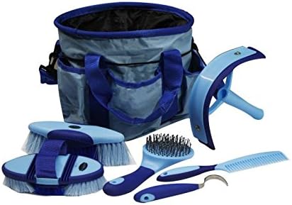 Showman 6 piece soft grip grooming kit with nylon carrying bag. Grooming kit comes with plastic sweat scraper, soft grip mane comb with handle, soft grip hoof pick, soft grip medium bristle brush, soft grip flexible handle body brush, and soft grip mane and tail brush. Comes with nylon carrying bag. Made by Showman Products.