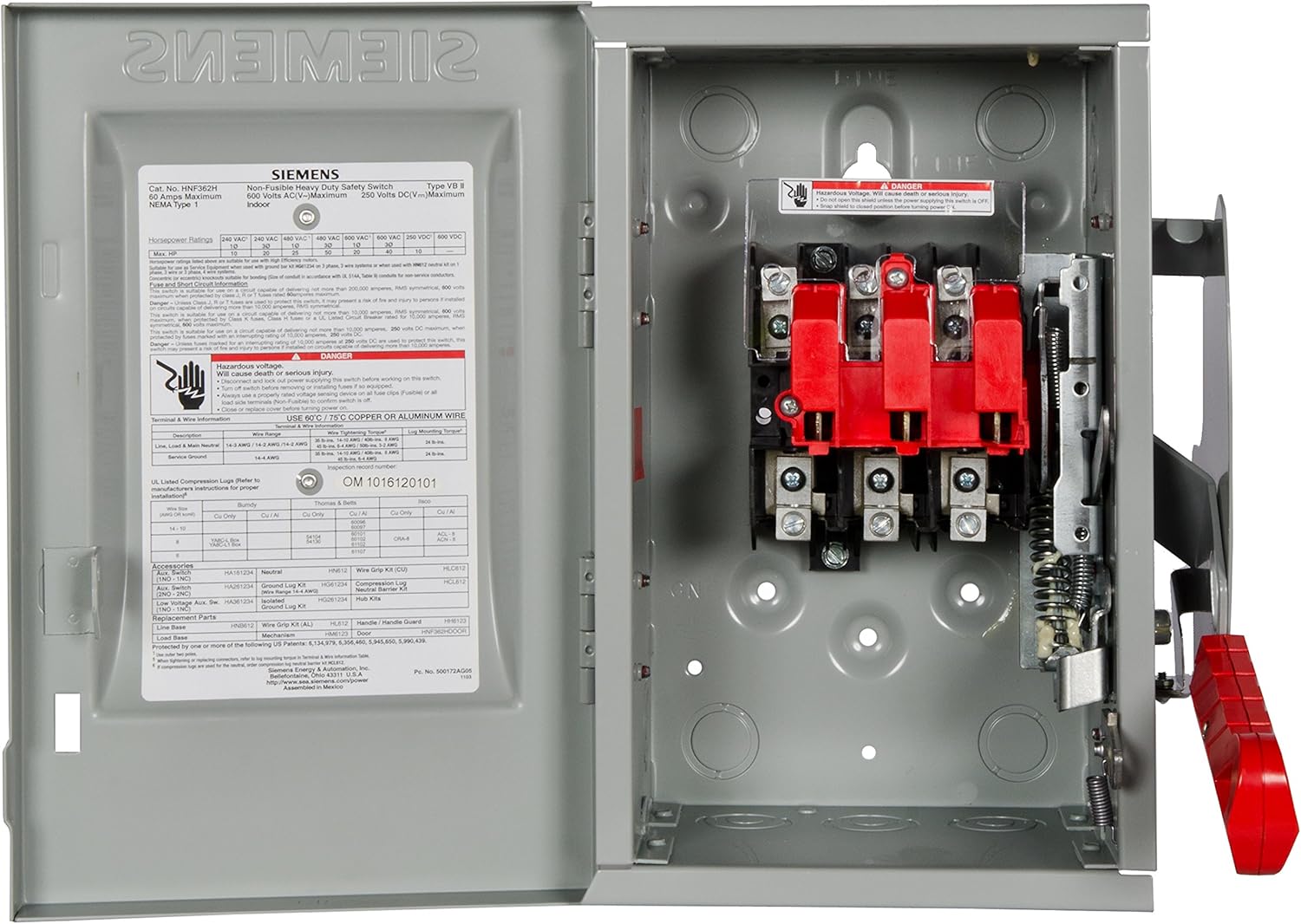 Siemens heavy duty safety switches are available in 30-1200A ratings and in Type 1, 3R, 12 and 4X enclosures. Both fusible and non-fusible versions are offered. They can be used on circuits that are rated through 200K when protected by or used with Class R or J fuses. They feature quick make and break operation and visible blade construction.