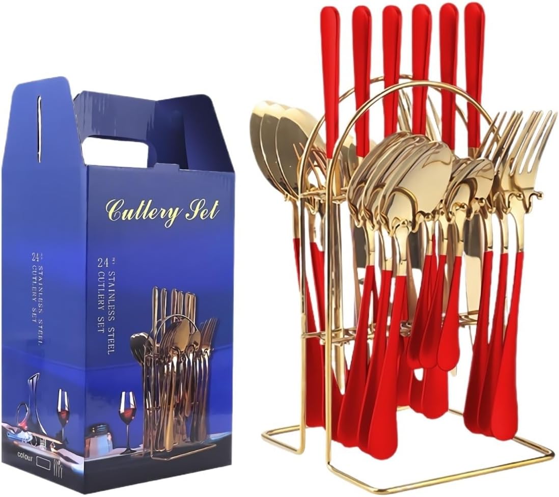 Material: Stainless steelPolishing process: Cloth polishing (mirror polishing)Set list: Knife, fork, spoon, teaspoon, gift boxStainless steel material: 410 stainless steelSpecifications: 24-piece pendant set (silver)Specifications: 24-piece pendant set (gold)Specifications: 24-piece pendant set (rose gold)Specifications: 24-piece pendant set (rainbow color)Specifications: 24-piece pendant set (black)Specifications: 24-piece pendant set (blue and gold)Specifications: 24-piece pendant set (black and gold)Specifications: 24-piece pendant set (white gold)Specifications: 24-piece pendant set (red and gold)Specifications: 24-piece pendant set (pink gold)Product quality level: first-class productFunction: Knife, fork and spoon gift box setStyle type: simple styleProduct category: Knife, fork and spoon set.About our BrandOur brand is GOODJAYVEN. We have always been committed to Household items. Do our best to bring more creative products to our customers.