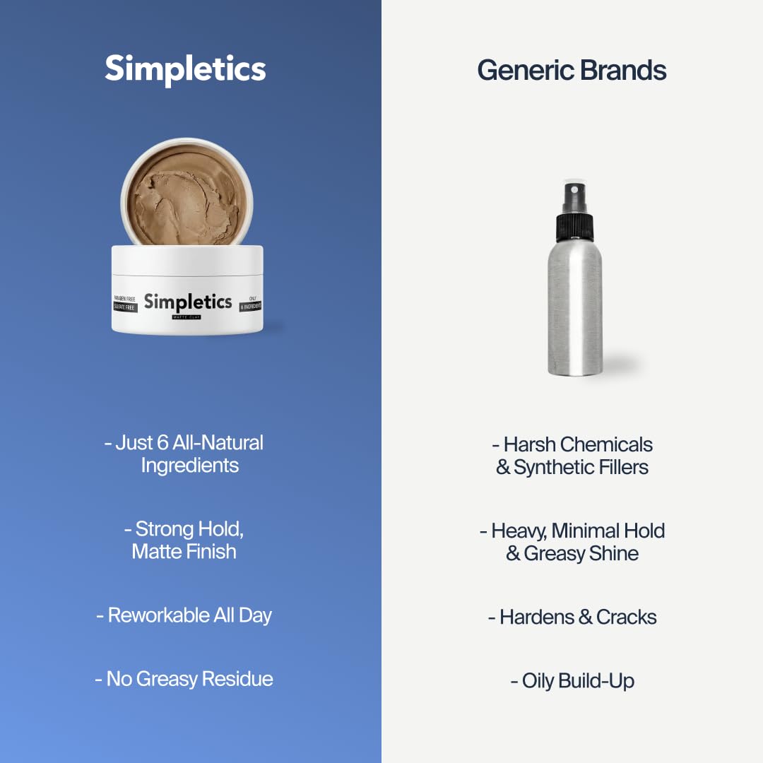 Simpletics Hair Clay uses just six clean, high-performing ingredients to give you strong, flexible hold with a natural matte finish, no grease, no buildup, no chemicals. Made for men and women, it adds texture, volume, and control to all hair types, whether you're going for a messy, effortless look or a structured style. Unlike most products with 15–30 ingredients, Simpletics keeps it simple: bentonite clay for texture and oil control, beeswax for hold, coconut and castor oils to nourish, purified water for smooth application, and essential oils for a fresh, subtle scent. That’s it. Paraben-free, sulfate-free, phthalate-free, alcohol-free, and handmade in small batches to ensure purity and performance. Easy to apply, easy to rinse out, and designed for short to medium lengths. Scoop, warm between hands, apply to dry or damp hair, and style as you like. Rework anytime. Clean, effective, and never overdone.