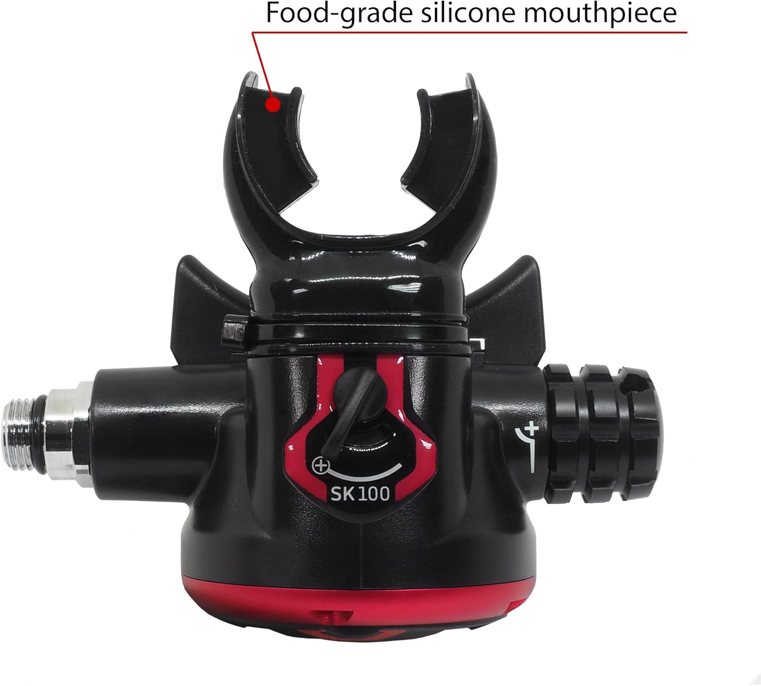 First stage:- Non-balanced flow-by-piston design- One high-pressure and three low-pressure portsSecond stage:- Second stage with a 27” black hose- Balanced design- Venturi lever → Dive/ pre-dive adjustment to prevent free-flow- Adjustment knob → Adjust inhalation effort based on your preference- Anodized aluminum cover ring → Anti-corrosion and anti-wear- Comfortable black silicone mouthpiece- 30-degree inline swivel → Reduce jaw fatigueWeight (without hose): 0.42 lbs (189g)Dimensions (front profile): 2.67" (6.8 cm)Factory set inhalation effort: 1.1 CIW