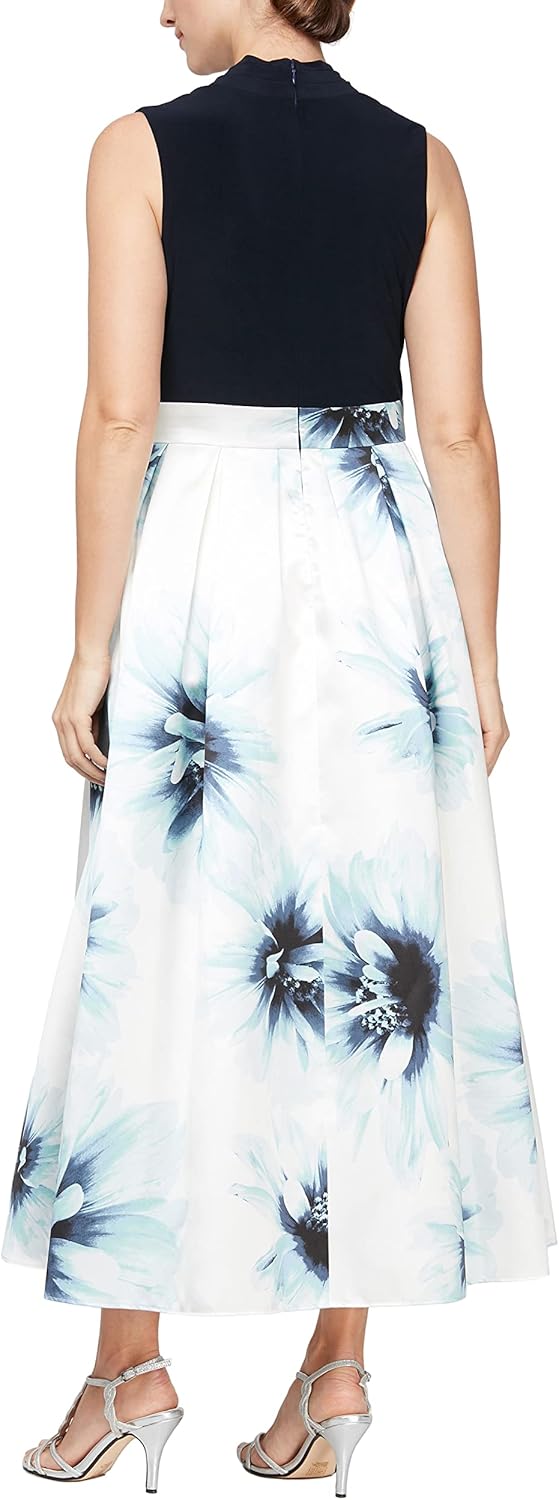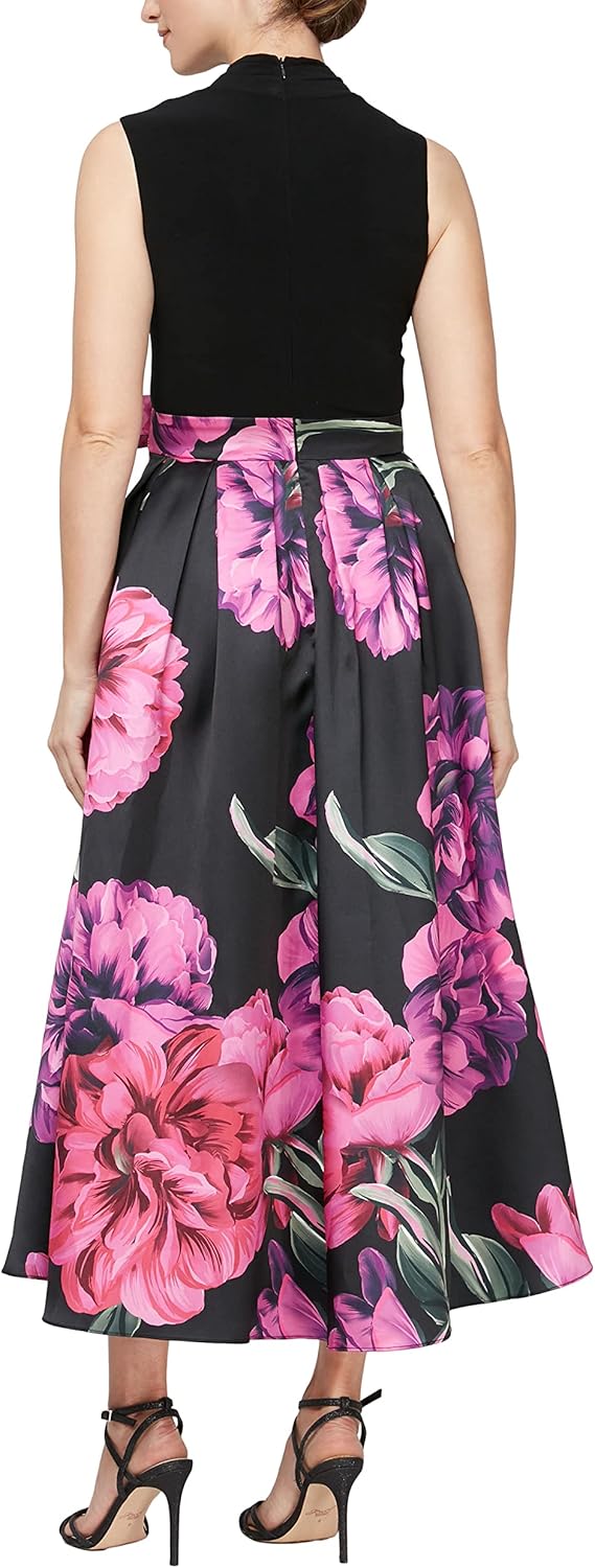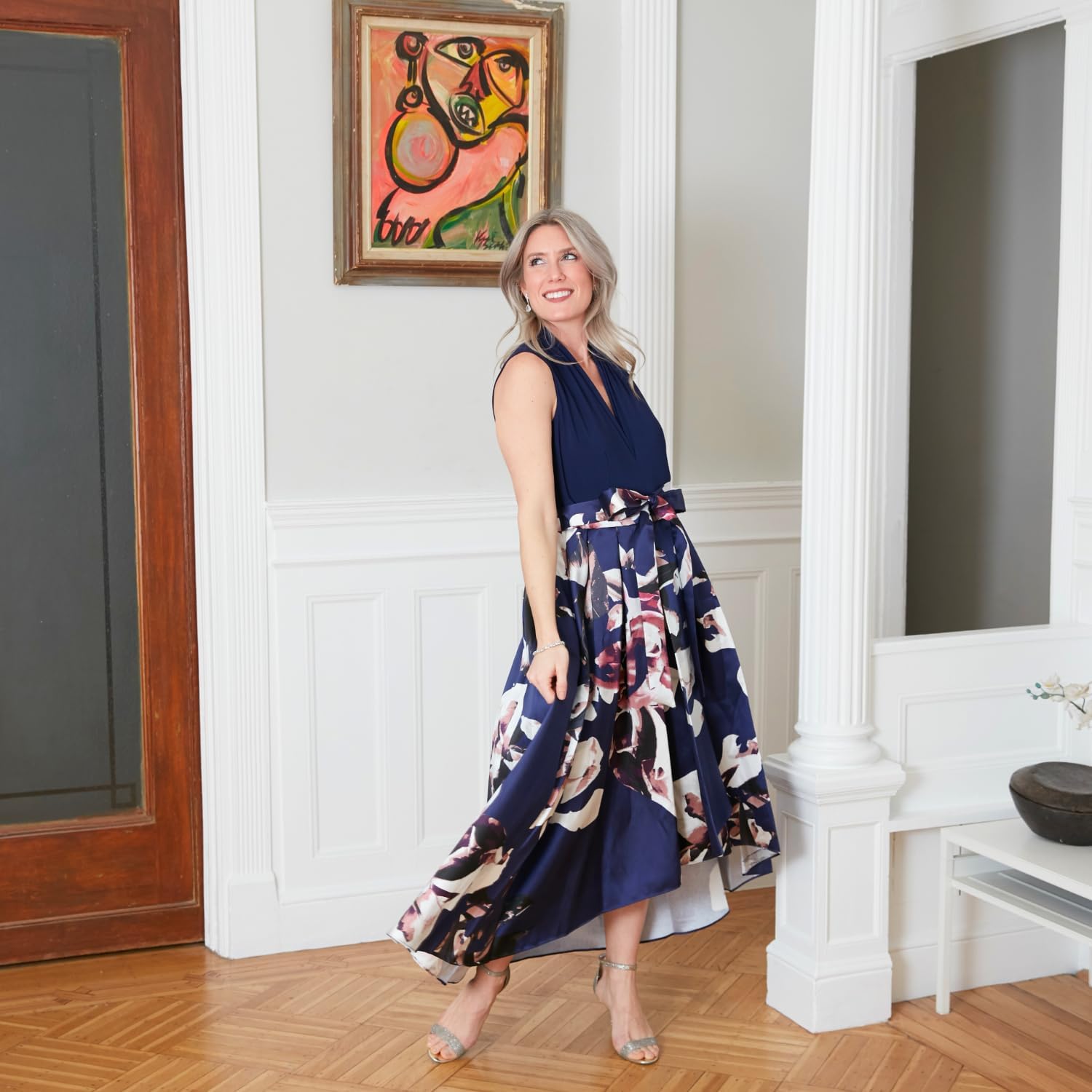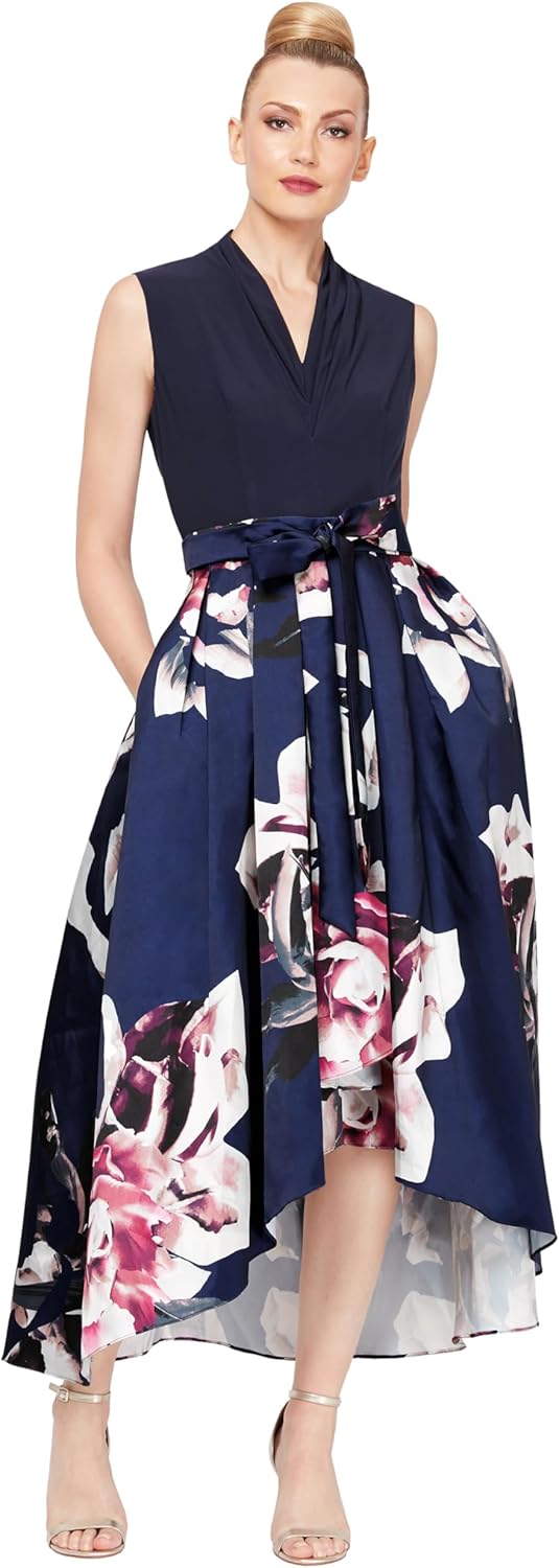 Step into elegance with the S.L. Fashions Women's Sleeveless V-Neck Hi-lo Floral Wedding Guest Gown. This stunning party dress combines a stretch jersey V-neck bodice with an allover floral printed Mikado pleated skirt, creating a sophisticated and feminine look. The self-tie belt accentuates the waist, adding a touch of refinement. Designed with practicality in mind, the dress features discreet pockets, making it both stylish and functional. The hi-lo pleated skirt adds a modern twist to this classic design, perfect for weddings, parties, and other special occasions. Available in petite and regular sizes, this gown ensures a perfect fit for all body types, with an invisible back zipper providing a seamless and elegant finish.