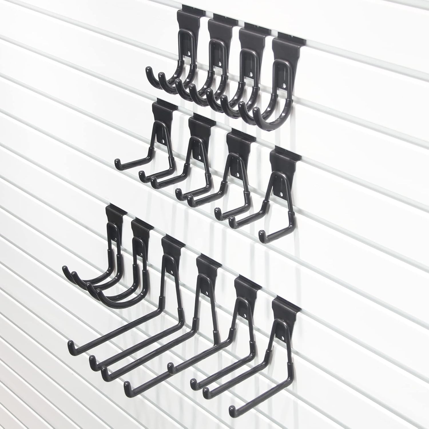 Our ATOOLA slatwall accessories are budget-friendly yet functional. Nice sturdy, easy to install and move around. You will be pleased with the value and quality of our slatwall hooks. Specifications: - Color: Black - Material: Vinyl-coated, Metal Package Contents: - 4 x Small U Hook - 8 x Medium U Hook - 2 x Large U Hook - 4 x Small J Hook - 2 x Large J Hook (screws not included)