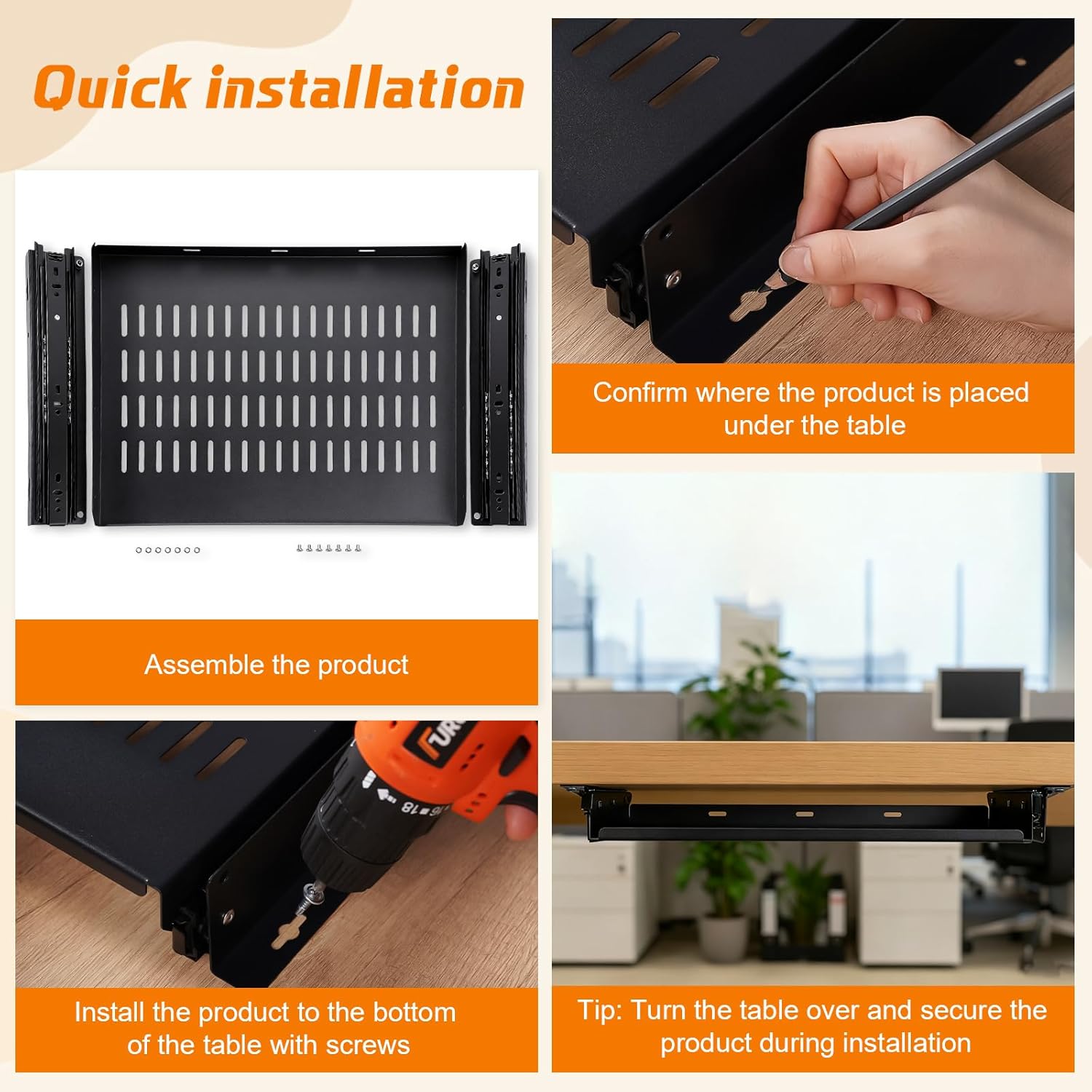 Features: The under desk laptop tray is suitable for sending to your friends, colleagues, relatives, neighbors, family members and others you care and love, they will be happy to receive this gift. The under desk laptop shelf smoothly extends to provide additional storage space for office supplies, tools, or personal items. Keep your workspace clean and organized, ensuring everything you need is within easy reach. Enjoy a tidy environment that boosts productivity and comfort. Specifications: Material: iron Color: black Size: W 19.3" (including the 2 side brackets) x D 12.04" x H 2.36". Internal Usage Space: 16.25" W x 11.9" D Package includes: 1 x Sliding under desk laptop mount shelf Notes: Manual measurement, please allow slight errors on size. The color may exist a slight difference due to different screen displays