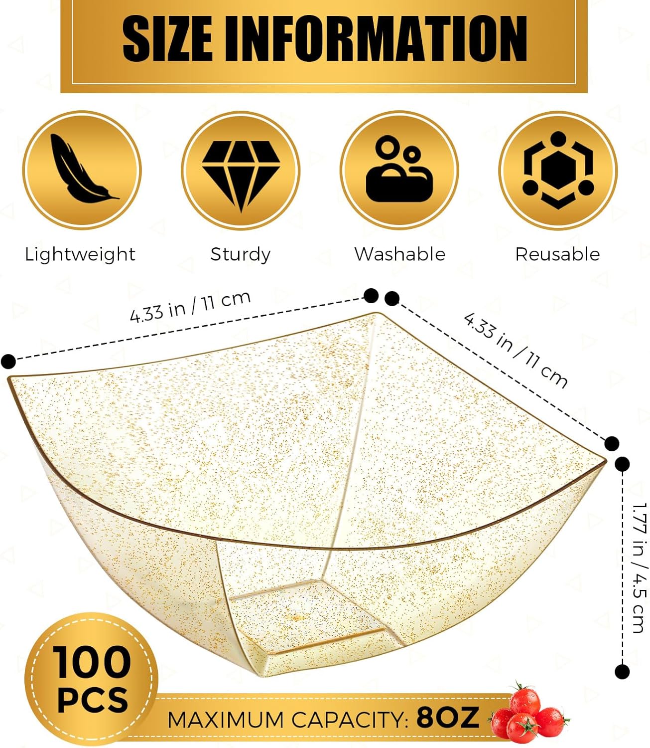 Features: Square shape: The interesting square shape and gold glitter design of these fruit bowls for party adds a touch of elegance to most settings. Whether it's for serving appetizers at a party or snacks at a meeting, these modern bowls earn noticeable appreciation from guests. Practical gift idea: Not just for personal use, these plastic salad bowls can serve as unusual yet practical gifts. Ideal for a new homeowner, a college student settling into their dorm, or an artist who could use the bowls for storage purposes, these multipurpose bowls offer both decorative and practical purposes. Specifications: Material: plastic Color: gold glitter Size: about 4.33 x 4.33 x 1.77 inches/ 11 x 11 x 4.5 cm Capacity: about 8 oz Package includes: 100 x Gold glitter plastic bowls Notes: Manual measurement, please allow slight errors on size. The color may exist a slight difference due to different screen displays.