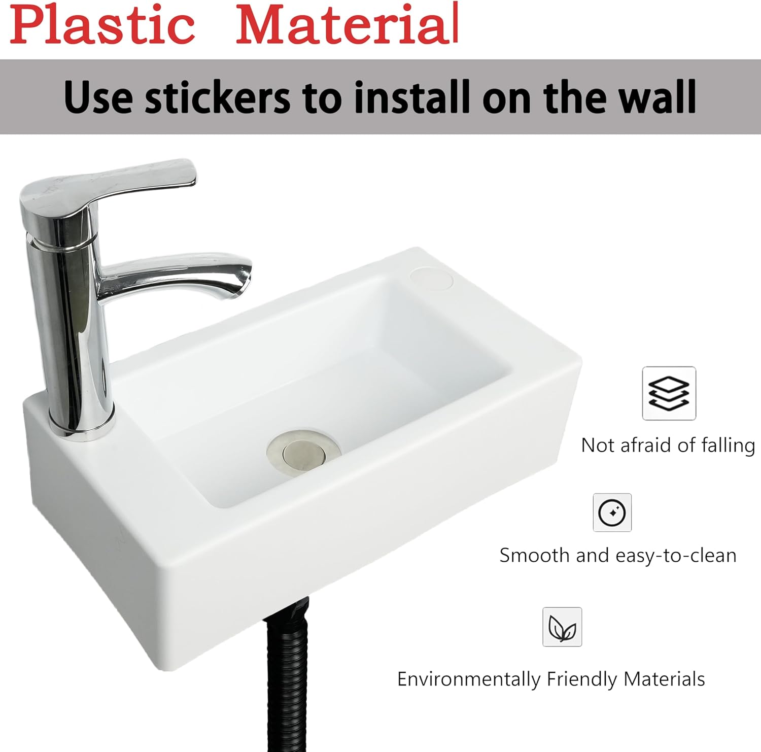 | Included Components | 1. small plastic hand wash basin 2. retractable anti-odor drain hose (1m/40in) 3. perforated screws 4. adhesive patch + spare adhesive patch |