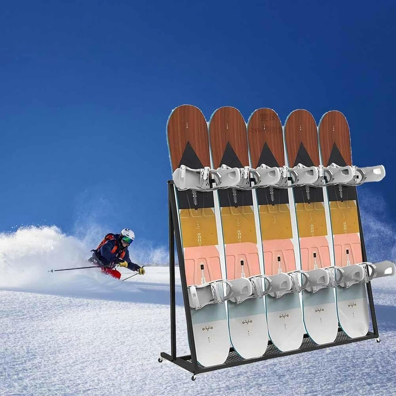 Storage assistant in the snow, with 4 universal wheels, can be moved around in ski resorts, stores, snowboard display centers.Product Description:1. Can store skateboards, clubs, basketballs, sports mats and various sports.2. Large capacity display holds up to Can display 5 skis.Specification:Material: SteelSize: 55x45x120 cmStorage Capacity: 4-5Whether To Assemble: assemblyColor: BlackPackaging:1x Snowboard Holder