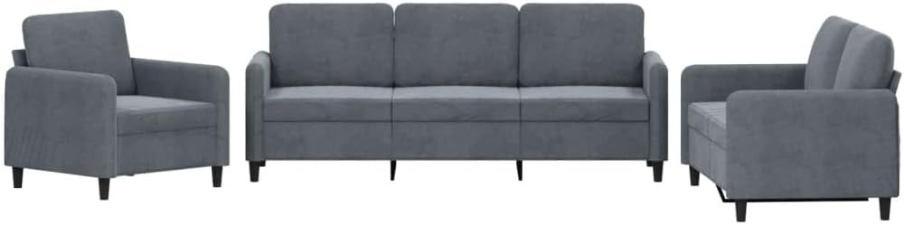 This classy 3-piece sofa set gives a sophisticated vibe to any space, dressed in rich dark grey velvet that’s both stylish and comfy. Its contemporary design fits right in with loads of interior styles while offering plenty of seating for gatherings, reading, or just chilling after a long day.Stylish Velvet Finish: The soft-touch velvet fabric adds a luxurious feel while being tough enough for everyday use. Its muted dark grey color makes it a stunning centerpiece in any room.Boxed Seat Cushions: Each seat cushion is designed with boxed edges and firm foam padding, giving you great support while you sit.Ample Cushioning: The set includes six comfy cushions, perfect for lounging or using as back support, letting you find your best relaxing spot while binge-watching or hosting.Durable Construction: Built with a plywood frame and sturdy legs, this sofa’s solid enough to last without sacrificing style, letting you enjoy it for years ahead.Easy Maintenance: The velvet fabric is easy to clean, just dust it with a dry cloth or blot spills quickly. Regular upkeep keeps it looking sharp as time goes on.Colour: Dim Grey Shape: RectangularMaterial: Farbic VelvetFinish: Soft-touch velvet finishIndoor/Outdoor: Indoor OnlyCover Included: NoRoom: Living RoomMaximum Number of People: 7Dimensions: 77 x 198 x 80 cm (W x L x H)Leg Height: 19.0 cmSeat Depth: 50.0 cmSeating Capacity: 7Swings: NoDelivery Contains: 1 x Sofa chairAssembly Required: YesRecommended Number of People for Assembly: 2SKU: 3201935