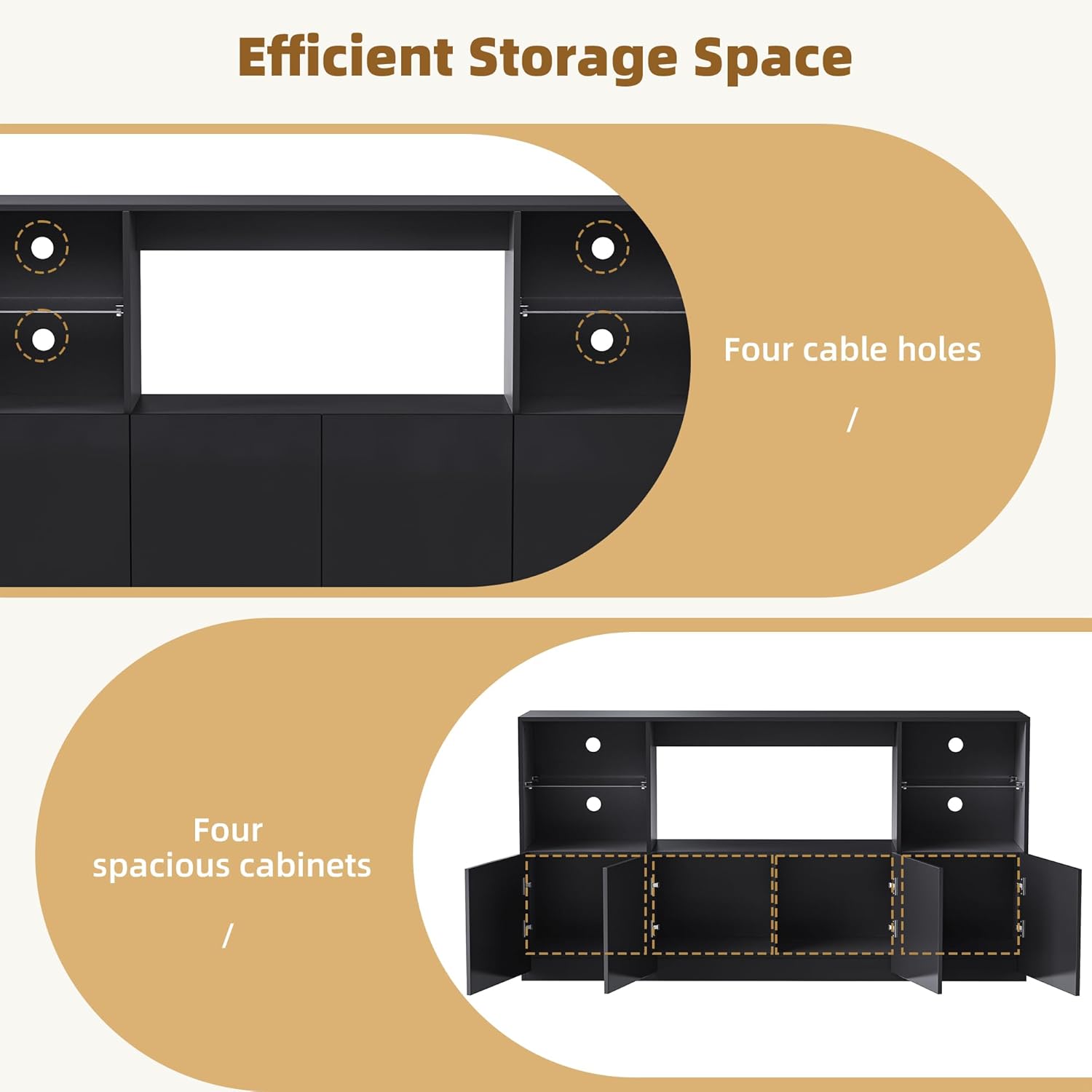 Product details Product Type: TV Stand Top Color: Black Top Material: MDF Top Finish Application: Veneer Base Color: Black Base Material: MDF Base Finish Application: Veneer Weight Capacity Overall: 400LBS / Desktop: 110LBS / Cabinet: 110LBS / Shelf: 22LBS Detailed Measurement Overall: 67.7”W x 13.7”D x 35.4”H / Cabinet: 16.6”W x 12.4”D x 13.4”H Country of Origin: China Cabinets Included: Yes Number of Cabinets: 4 Shelves Included: Yes Numbers of Shelves: 2 Shelves Material: Tempered Glass Table Top Thickness: 0.59 inch Level of Assembly: Full Assembly Needed Suggested Number of People for Assembly/Install: 2 Estimated Time to Set Up: 2 h Adult Assembly Required: Yes Additional Tools Required (Not Included): Power Drill Recommended Notice 1. The plastic film for protecting UV from scratches should be teared off before putting into use. If there is light dust on the edge, it can be wiped with a wet rag. 2. Please note that the LED light strip has a USB port but does not include a power adapter/charger. Customers need to prepare it by themselves.