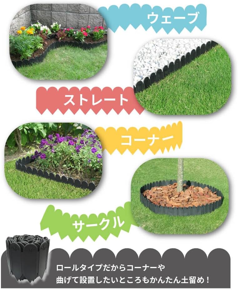 The integrated sheet reduces soil leakage without needing to be linked. Can be installed in straight areas, as well as in curved and circles. Hinged construction allows for right angle bending. Can be cut to fit the installation location with scissors. Rubber hammer for easy stamping.