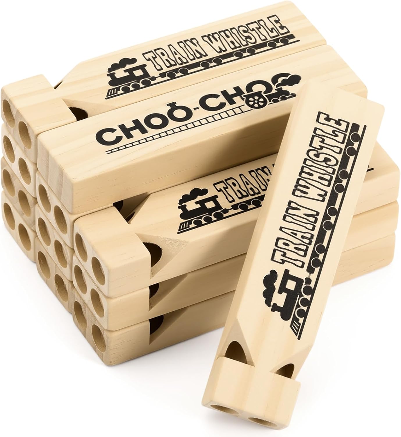 Features: These train whistles are an ideal gift for your friends and family to enjoy together. Simply blow into the whistle to produce a loud, authentic sound. It's a fun filled activity that adds excitement to any gathering, offering endless entertainment and delight. Specifications: Material: natural pine Color: wood color, black Size: about 5.51 x 1.38 x 0.79 inches/ 14 x 3.5 x 2 cm Package includes: 36 X wooden train whistles Notes: Manual measurement, please allow slight errors on size. The color may exist a slight difference due to different screen displays
