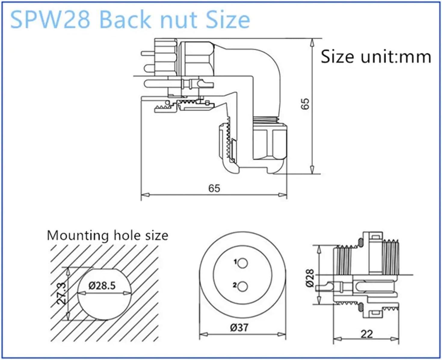 Split-Bolt ConnectorsProduct DescriptionSP28 IP68 elbow nut waterproof aviation cable connector 2/3/4/5/6/7/9/10/12/14/16/19/22/24/26-pin angle socketConnector type: SP28 elbow rear nut typeNumber of pins: 2/3/4/5/6/7/9/10/12/14/16/19/22/24/26 pinsWaterproof grade: IP68Packaging (set): 1 x connector