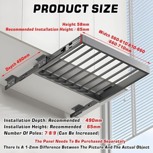 Introducing our innovative Pull-Out Clothes Drying Rack, designed to maximize your laundry space while offering exceptional durability and functionality. Made from high-quality aluminum alloy and ABS, this robust drying rack boasts impressive load-bearing capacity and long-lasting performance. Its smooth pull-out mechanism ensures quiet operation, preventing any wobbling during use. This retractable trouser rack is adjustable in width to fit various cabinet sizes, making it an ideal solution for diverse wardrobe configurations. Before installation, please measure your cabinet width to ensure a perfect fit. With the ability to accommodate multiple clothing items, our drying rack is perfect for utilizing narrow spaces efficiently. It seamlessly integrates into tight wardrobes, transforming limited areas into organized storage solutions. Additionally, it can be conveniently installed above your washer or dryer, creating a practical drying zone for jeans, pants, ties, scarves, and more. This feature not only enhances your laundry routine but also optimizes space in your home. **Specifications:** - Product Name: Pull-Out Rack Above Washing Machine - Material: Aluminum Alloy + ABS - Depth Options: 44/49/54 cm (17/19/21 inches) - Length Options: 56-61 cm (22-24 inches), 61-66 cm (24-26 inches), 66-71 cm (26-28 inches) - Height: 5.8 cm (2.3 inches) - Recommended Installation Height: ≥ 6.5 cm (2.5 inches) - Installation Depth: ≥ 44/49/54 cm (17/19/21 inches) - Number of Poles: 7/8/9 - Installation Methods: Side mounting and top mounting - Package Includes: 1 Pull-Out Clothes Drying Rack **Warm Tips:** 1. Due to monitor resolution, there may be slight variations in product color; please refer to the actual product. 2. Manual measurement may result in a 1-2 cm discrepancy; please verify with the actual product. 3. The panel is not included and must be purchased separately. Elevate your laundry experience with our Pull-Out Clothes Drying Rack and enjoy a clutter-free...