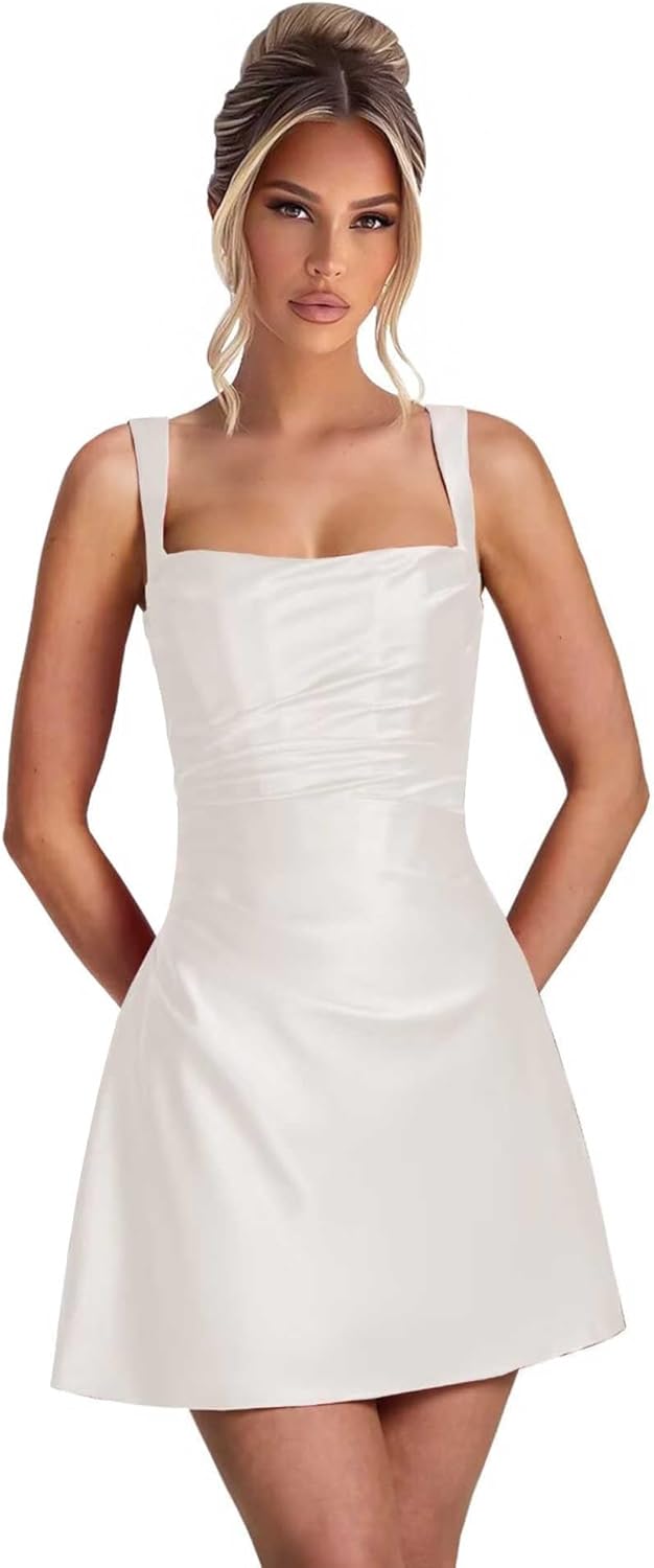 Welcome to Plakend, the store mainly sells bridesmaid dresses, prom dresses, flower girl dress and all kind of formal dress for women Linearity: Flowy A-Line Feature: Silk Satin, Wide Straps, Square Neck, Sleeveless, Empire Waist, Pleated/Ruched, A-Line, Corset Backless, Petite, Tight, Elegant, Above the Knee Back: Lace Up Backless 1.Please confirm your size with us after placing your order. 2.Of course, we also support customized size, you can tell us your size after you place an order, we will make the dress according to your size. Bust:_____ inch Waist:_____ inch Hips:_____ inch Shoulder to Floor: _____ inch 3.If you have any questions, please ask us, we will provide you with the most effective solution as soon as possible!