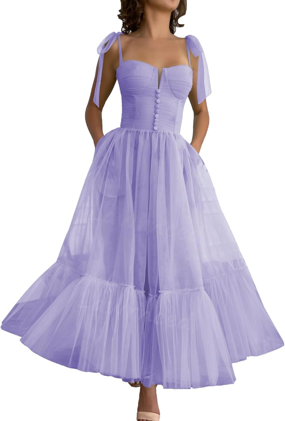 Spaghetti Straps Tulle Prom Dresses Tea Length Sweetheart Formal Gowns A-Line Party Princess Dress with Pockets