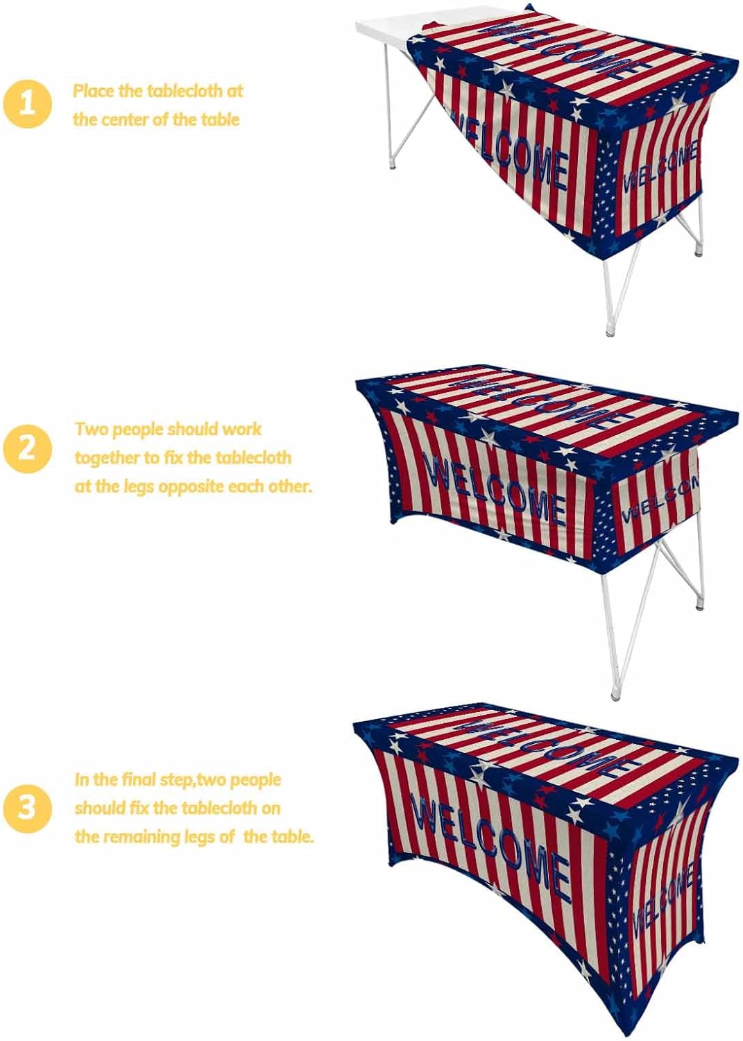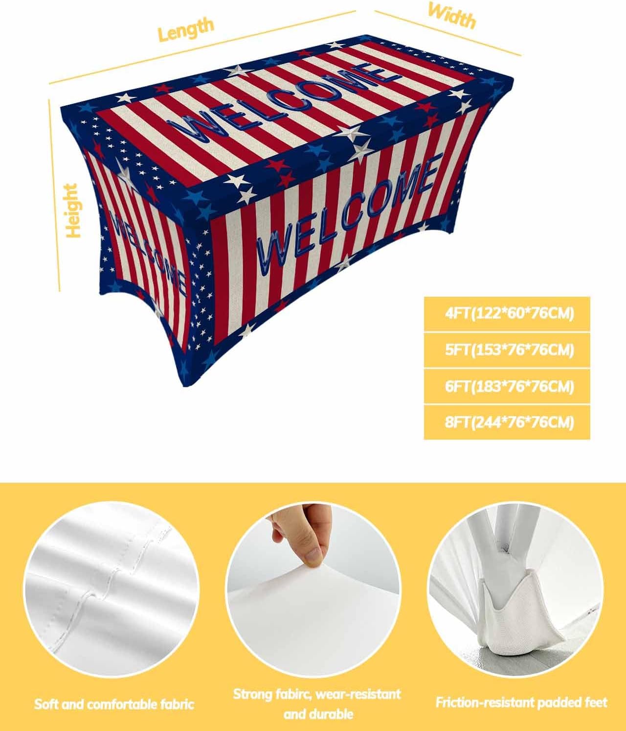 Material: polyester and spandex 4 Size Available: spandex table covers 4 Ft: 48" L x 23.6" W x 30" H spandex table covers 5 Ft: 60" L x 30" W x 30" H spandex table covers 6 Ft: 72" L x 30" W x 30" H spandex table covers 8 Ft: 96" L x 30" W x 30" H To make sure getting the perfect fitting, please measure your table before ordering. About Our Stretch Spandex Rectangle Table Cloth/Tablecloths For Rectangle Tables/Rectangle Tablecloth/Table Cloths Rectangle/Tablecloth Rectangle/Rectangle Table Cover/Table Cloth Cover: -High-quality and durable fabric fitted table cloth rectangle table, soft and stretchable, durable, lightweight, wrinkle free, durable and long lasting. -This spandex dining table cover has elastic pockets on the inside of the bottom so the legs of the table can go inside. This design ensures that the tablecloth stays in place and does not move or slide during your event. -This 4ft/5ft/6ft/8ft table cover fitted is soft and stretchy, easy to use and easy for you to put the tablecloth on yourself with no problems. -This patio table cover is wrinkle resistance and reusable cover, an easy way to give a new life to your old or peeling chair, also keeps your chair from dust, stains, daily tears, scratch, ect. -You can as easily take off the 4ft/5ft/6ft/8ft stretch table cloths for 4 ft/5 ft/6 ft/8 ft tables to wash, hand to clean it or throw it in the washing machine, easy to care for. -No ironing needed: Please note that table cloths for 4/5/6/8 foot rectangle tables may seem wrinkled when you open them and start covering the table. But once you stretch them out on all four legs of the table, there are no wrinkles. -After using, just wash table cloths for 4/5/6/8 foot rectangle tables and fold away and they are ready for the next use. You can use outside who cares if it's windy! They are always perfectly attached to your tables and look super smooth.