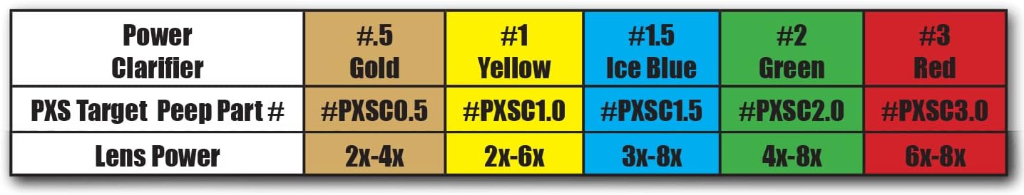 Clear up your target with the PXS clarifier lens. Hydrophobic lens coating repels dust, smudges, fingerprints, scratches and water. #0.5 Gold, #1 yellow, # 1.5 Ice Blue, #2 Green, and #3 Red. Fits into Specialty Archery PXS Target Peep ONLY.