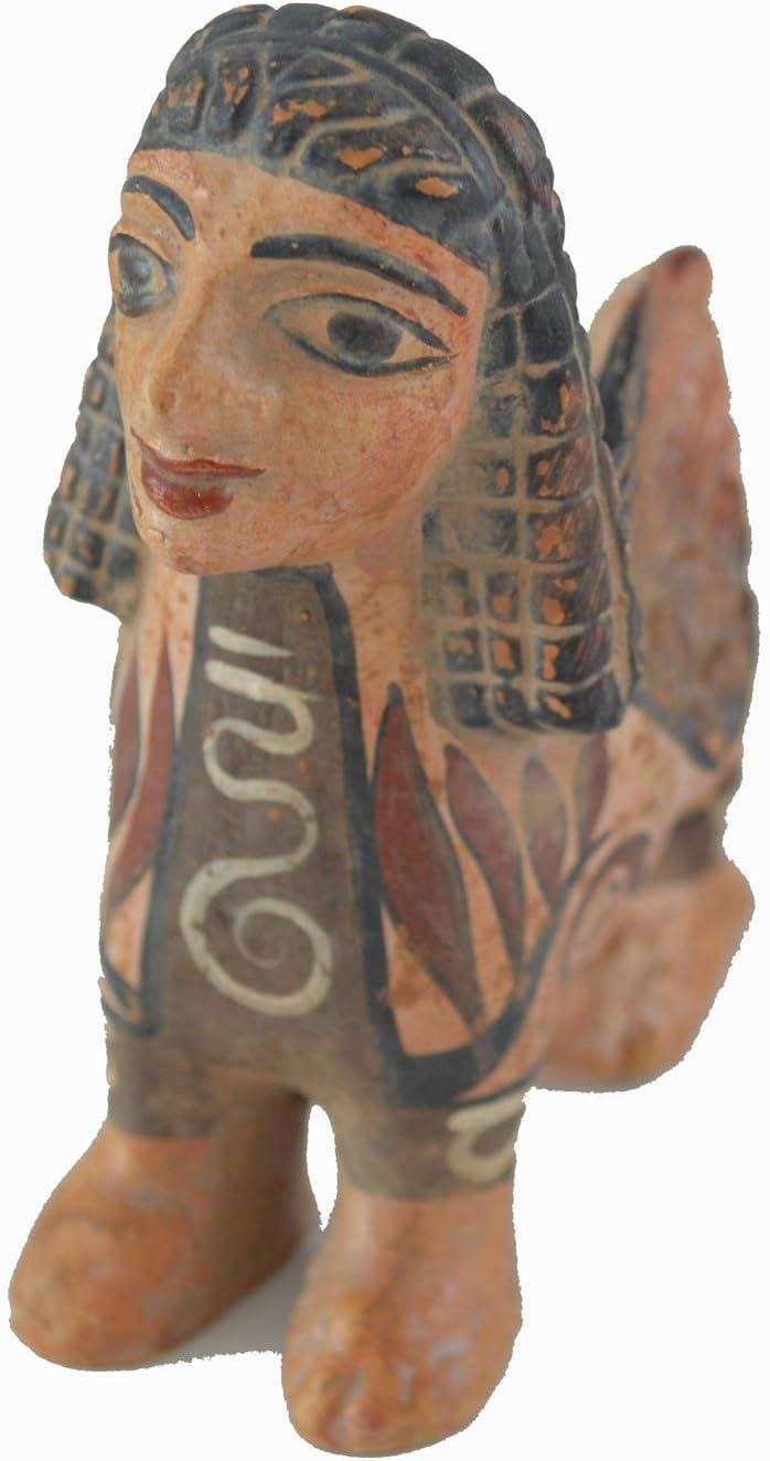 A sphinx is a mythical creature with, as a minimum, the body of a lion and a human head. In Greek tradition, it has the haunches of a lion, sometimes with the wings of a great bird, and the face of a human. It is mythicised as treacherous and merciless. Those who cannot answer its riddle suffer a fate typical in such mythological stories, as they are killed and eaten by this ravenous monster. Spinx reproduction from Attica about 600b.c. (431 ) Details: Condition: New, made in Greece. Approximately Height: 12cm - 4.7 inches Width: 12cm - 4.7 inches Weight: 230g Material: Yellow clay