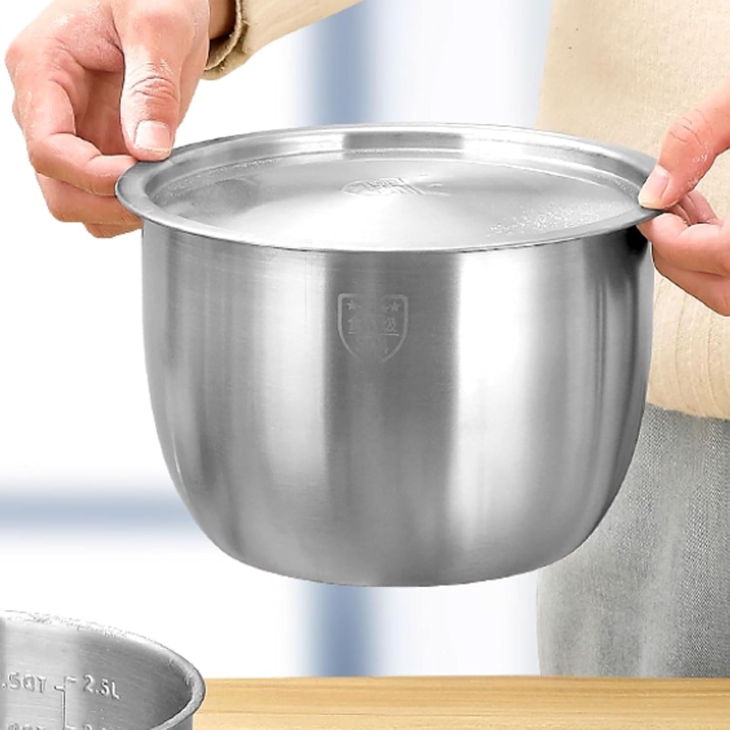 Convenient for storing and carrying food.Material: Stainless steelSize: 19cmx13cm/7.4x5.1in20.8cmx14cm/8.1x5.5inCapacity: 2500ml/87.9oz,3000ml/105.5ozColor: SilverScope of application: home, kitchen, restaurant, hotel, etc.Packing list: only includes Stainless steel mixing bowl with lid x1 (excluding other items shown in the picture)Kind tips1. Due to the difference in light and display, the color of the picture may be slightly different from the actual object, please refer to the actual object.2. The size is measured manually. If there is a slight error, please refer to the actual product received.3. Please wipe it clean immediately after use.4. For stainless steel products, please avoid scrubbing with hard objects such as steel wool.5. Stainless steel products may have slight wear and scratches on the surface, which will not affect the use.The nestable design saves space and makes it easy to store in shelves or cabinets.