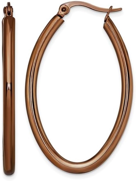 These affordable and fashionable oval shaped earrings create a cute casual pair of hoop earrings. These brown plated steel earrings weigh approximately 14.50 grams and are 1 1/2 inches in length.