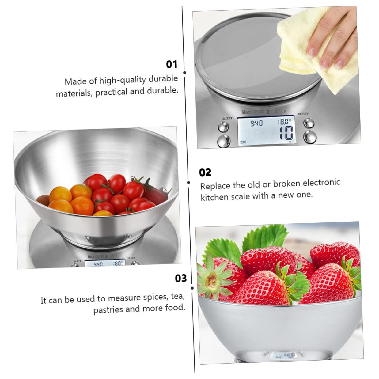 Package Include 1 x Set of Scale Features -Display mode: LCD blue light and black text High-Precision Scale -Size: About 21.50X14.50X6.00cm/8.45X5.70X2.36inch -Power-on method: push-button Scale for Home -Color: Assorted Color -Unit: g/lb/oz Kitchen Food Scale -Power supply mode: 2 * AAA7 batteries Multipurpose Scale -Product Info:Kitchen scales -Function features: zero setting, tare, unit conversion, alarm clock, temperature measurement Kitchen Scale -Material: Stainless steel -Function display: or overload display Electronic Scale -Weighing platform size: 100*100mm -Weighing range: 1g-5000g Display Scale -The product can be used to measure spices, tea, pastries and more food Food Scale. -Replace the old or broken electronic kitchen scale with a new one Stainless Steel Scale. -Made of and stainless steel material, practical and . -Very suitable for kitchen baking and weighing, reliable and Stainless Steel Electronic Scale. -A good kitchen measuring tool can help you measure various foods Kitchen Gadget.Goods DescriptionScale for Home The for you for kitchen weighing and calculating.Stainless Steel Scale This item is a good scale, adoption of premium and stainless steel material.Electronic Kitchen Scale This kitchen food scale can calculate weight and nutrition directly, which is convenient and practical