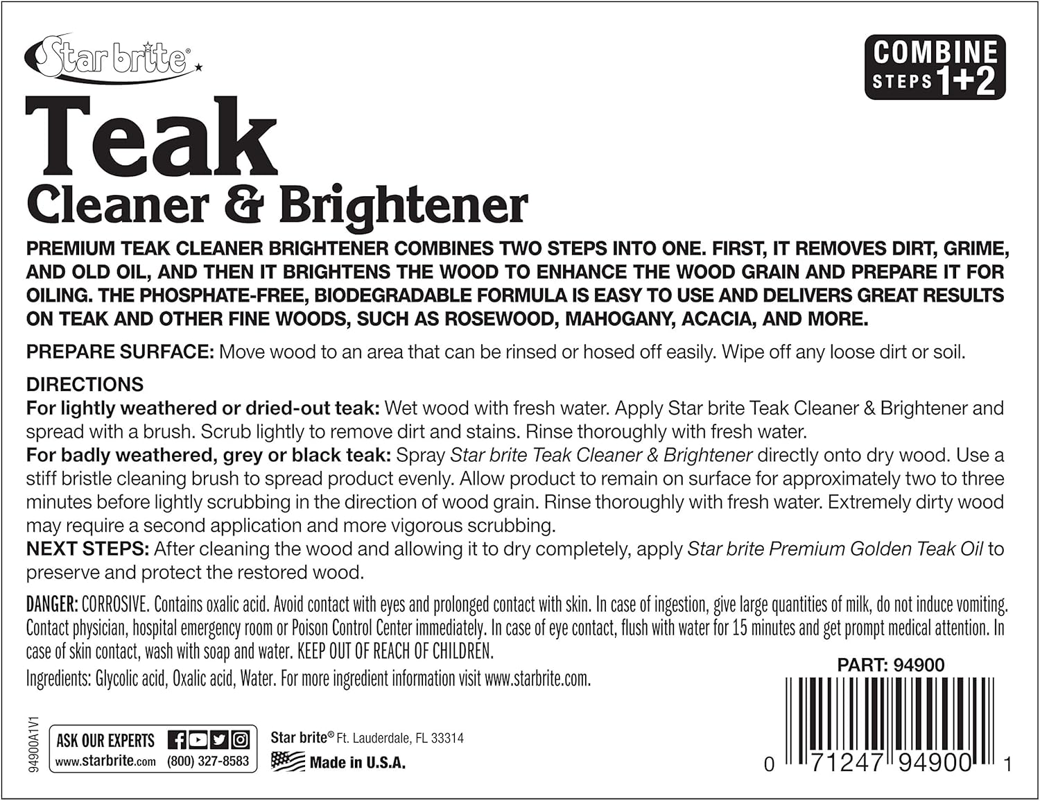 STAR BRITE Premium Golden Teak Oil - Sealer, Preserver, & Finish for Outdoor Teak & Other Fine Woods - Step 3 - 32 OZ (085132)STAR BRITE Premium Golden Teak Oil: The Ultimate Sealer, Preserver, and Finish for Marine Teak and Other Fine Woods. Transform and protect your teak surfaces and fine wooden furniture with STAR BRITE Premium Golden Teak Oil. This ultra-refined, high-quality teak oil is suitable for all fine woods, including acacia wood and Amazonia hardwood, providing a stunning natural warm golden color while protecting against harsh weather, saltwater marine environments, and damaging UV rays. STAR BRITE Premium Golden Teak Oil is specially designed to create high molecular weight polymers that withstand long-term exposure to harsh elements, making it the perfect choice for marine teak, wood furniture, and other fine woods. Its easy application process and the added UV protection make STAR BRITE Premium Golden Teak Oil the go-to solution for preserving and enhancing the beauty of your teak and fine wood surfaces. Ideal for boats, outdoor furniture, teak shower benches, teak shower mats, and all fine hardwoods. HOW TO USE: If the wood is dirty and/or weathered, first treat it with STAR BRITE Premium Teak Cleaner and STAR BRITE Premium Teak Brightener. Apply to dry teak surfaces using a clean cloth, sponge or brush. Apply by working in the direction of wood grain to maximize penetration of oil into wood. Wait 5 minutes before wiping treated area with a clean cloth to remove excess oil. Apply a second coat only if wood is extremely porous. Reapply STAR BRITE Premium Golden Teak Oil at the first sign of weathering.STAR BRITE One Step Teak Cleaner & Brightener - 32 OZ (094932) , WhiteStar brite Teak Cleaner and Brightener is specially formulated to transform old gray and black stained teak in one step.