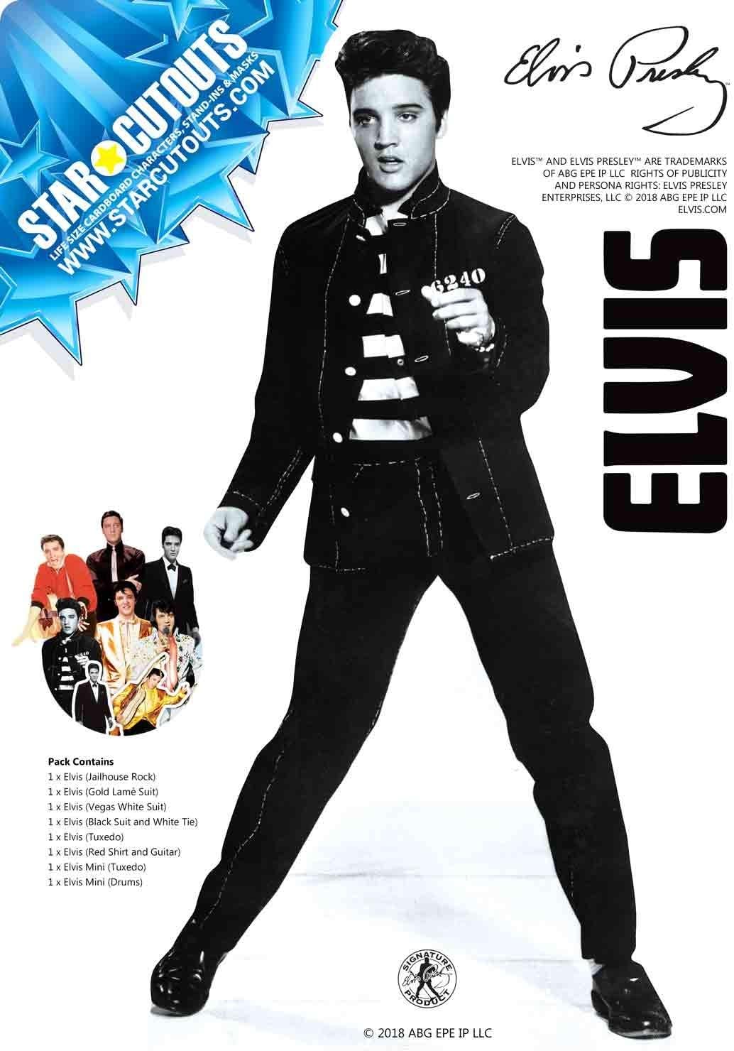 Everybody has a favourite Elvis image and now you can relive the joy of the first time you saw Elvis and create an amazing Buzz of excitement. These table top cut outs can be used to add the fun factor at parties, work to amuse yourself and colleagues at your desk and at home to treasure your favourite Star. All table tops are double sided. Elvis Presley enterprises product manufactured by Star Cut-outs. With this Elvis Presley table top cardboard cut-outs you are sure to create the atmosphere you want. It is time to get all Shook Up. 1 x Elvis (Jailhouse Rock) 28cm. 1 x Elvis (Gold Lamé Suit) 29cm. 1 x Elvis (Vegas White Suit) 29cm. 1 x Elvis (Black Suit and White Tie) 29cm. 1 x Elvis (Tuxedo) 29cm. 1 x Elvis (Red Shirt and Guitar) 29cm. 1 x Elvis Mini (Tuxedo) 11cm. 1 x Elvis Mini (Drums) 11cm