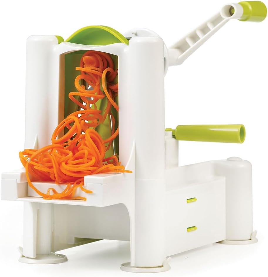 Spiral slicer, Mfg# 094236-002-new1, with 3 Ultra sharp interchangeable blades (slicing, fine, and medium spiral), suction feet, blade storage in base, Easy cleaning.