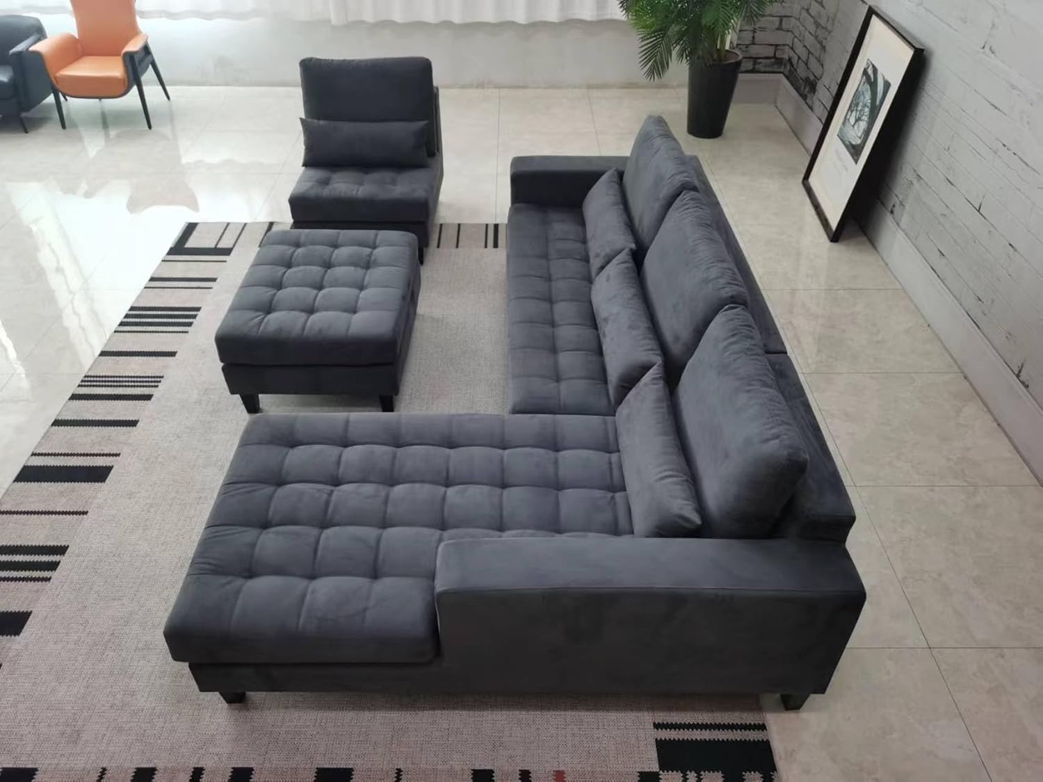 S6839 4pc. L shape sectional microfiber sofa set is well constructed with high back support. Set includes: Facing Right-Sofa +Left-Chaise +Armless Chair + Ottoman set in Dark Grey microfiber fabric finish, Legs in Black plastic (Configuration is as shown in the photos)Packing info: 1 large pallet included 4pc. sofa set plus one box of sofa leg/screws (screws have pointy end please handle with care)