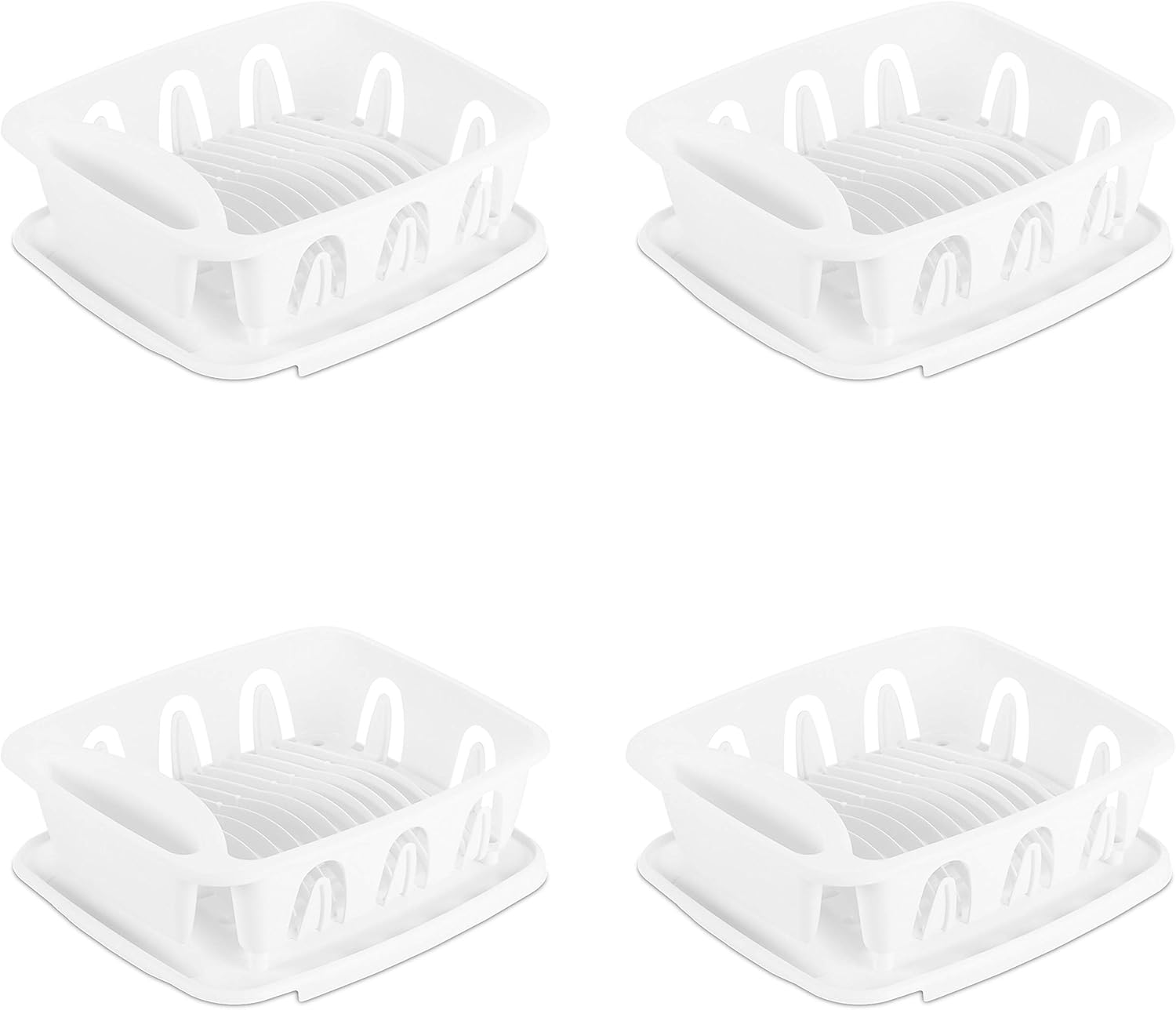 The Sterilite Large 2 Piece Sink Set is made for use in the kitchen sink area and is ideal for drying flatware, plates, bowls, and cups. It includes a dish drainer and drainboard that are attached, yet detach easily for cleaning. The inclined drainboard allows excess water to flow easily into the sink. The dish drainer offers an oversized flatware holder and can comfortably accommodate 14 large plates, 7 small plates or bowls, and 8 cups. The unique system of channeled grooves, hold dishes in place neatly and the perimeter cup holders around the sides hold a maximum of 8 cups. The overall assembled dimensions of this item are 21 1/8" L x 14 3/4" W x 6 1/8" H.