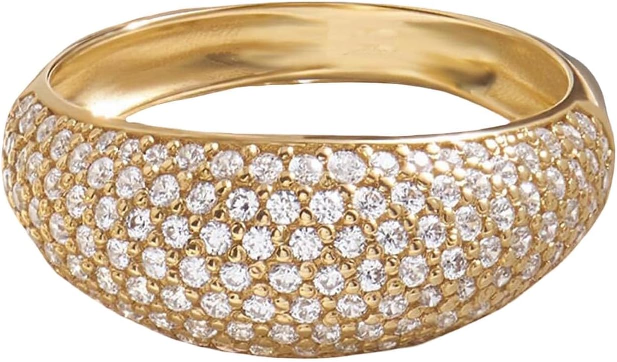 Premium Pave Dome Ring Make a bold statement of luxury and sophistication with our Premium Pave Dome Ring. Meticulously handcrafted, this stunning piece features brilliant-cut stones set along a thick, solid band. Its perfect blend of opulence and modern design makes it the ideal choice for those who dare to be different. Whether worn for a special occasion or as an everyday statement, this ring captures attention and elevates your style effortlessly. Details:- Stone: High Quality Cubic Zirconia Shape: Round Cut Weight: 0.58 Ct approx Color: G-H Clarity: VS-SI Band Width: 8 mm (Top) 3 mm (Bottom) approx (Please note that the original color and size of the stones used may slightly differ from the image shown.)