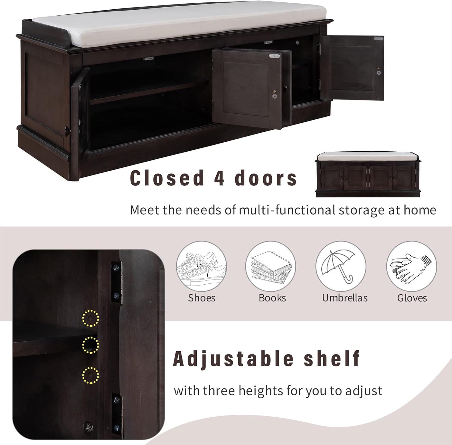 Weight and Dimensions: Product Dimensions and Weight: 42.7”L *16”W * 17.4”H 50.37 LBS Package Dimensions and Weight: 48.5”L* 19”W * 11.25”H 58.96 LBS Cabinet Interior Dimensions: 19”L * 15.1”W Door Dimensions: 10”L * 9.3”W Weight Capacity: Seat:200 lbs Cabinet:50 lbs Specifications: Material: Bench top/side panel/ bottom plate /door panel/Back plane: MDF Frame:Pine wood Thickness: Cushion: 2.2" Finish: Birch Veneer Finished Back: Yes Assembly Required: 30 min Additional Tools Required: All tools included Pieces Included: One Package Number: 1