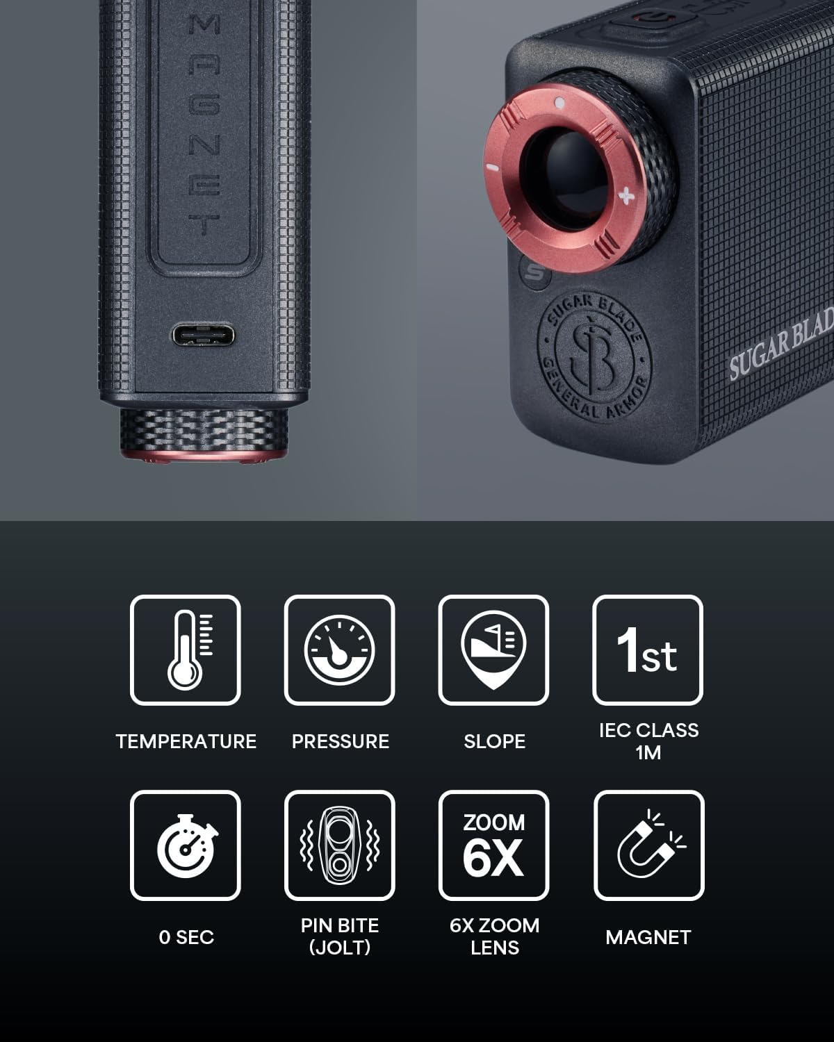 “S10 Engine will serve pin bite within 0.05 sec” “Same with Credit card or Business name Card (104.8 * 70.4 * 38.1mm)” “Attachable on the Cart” "Measuring 5yd - 700yd" "Slope mode and Non-slope mode can be switched anytime via one button."