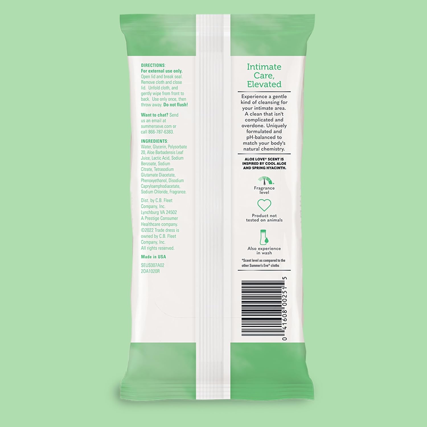 Experience a gentle kind of cleansing for sensitive skin with Summer’s Eve Aloe Love Feminine Wipes. pH-balanced to match your body’s natural chemistry, these gentle wipes are clinically and gynecologist tested and formulated to help remove odor-causing bacteria. Our gentle, micellar water formula helps remove vaginal odor for all day freshness, making these vaginal wipes ideal for daily feminine care. Use our intimate wipes after workouts, during travel or anytime, anywhere you need a quick refresh. Keep a resealable pack of these body wipes in your purse, gym bag, or bathroom cabinet for easy access. Hypoallergenic and made without dyes and parabens, these feminine wipes are safe for sensitive skin and never tested on animals. The Aloe Love scent, inspired by cool aloe and spring hyacinth, leaves you feeling fresh and confident. Pair our Summer’s Eve feminine wipes with our cleansing washes and sprays in a variety of scents for a complete feminine care routine. Summer’s Eve has over 50 years of experience in creating products designed for women and grounded in odor removal and freshness.