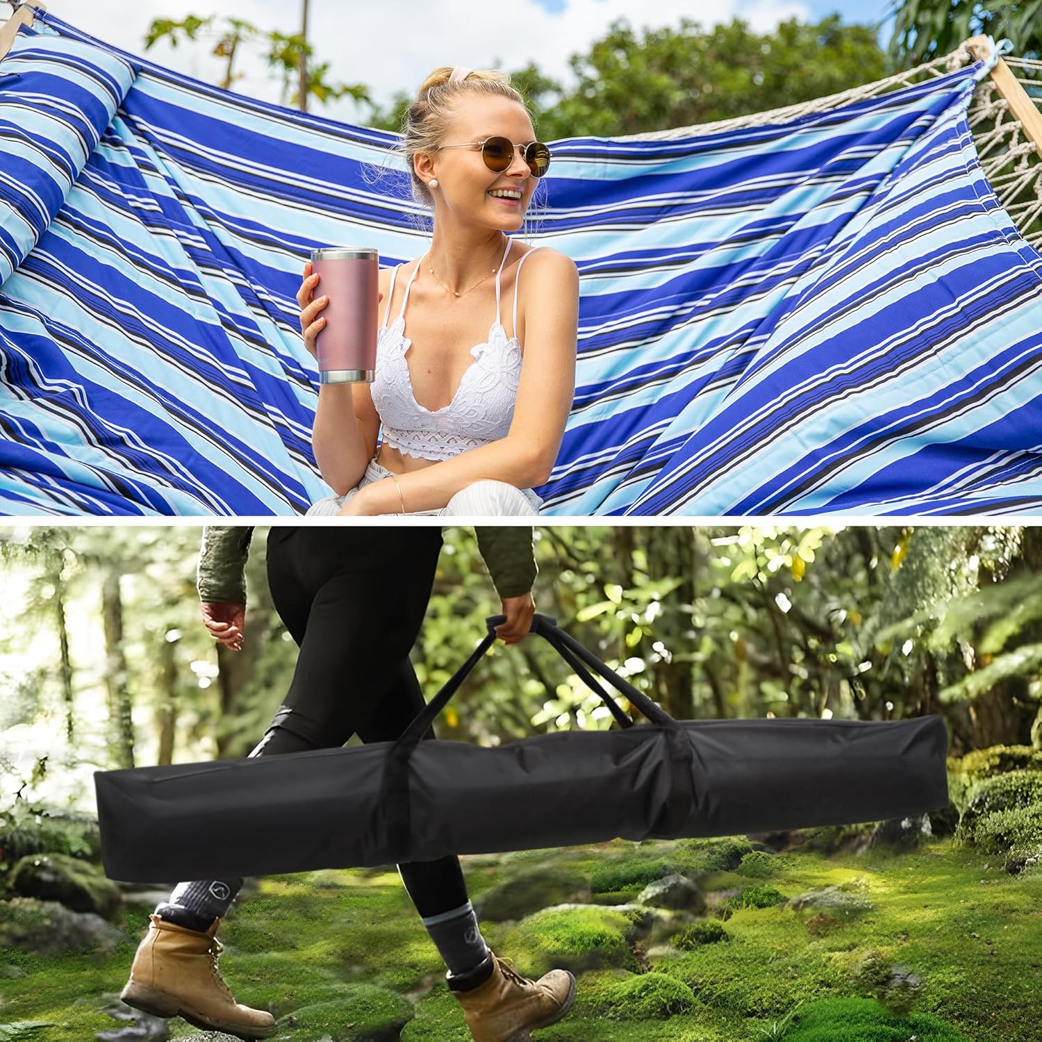 SUNCREAT Double Hammock with Stand, Outdoor Blue Stripe Hammock with Polyester Pad, Extra Large Zippered Hammock Bag, Black