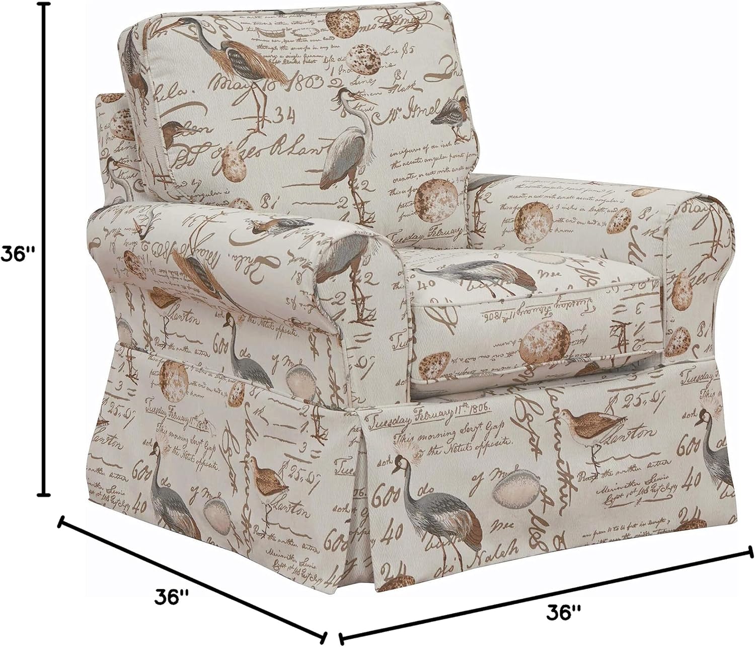 No matter the season, your living space can wear white denim in summer and blue after labor day, crisp linen in spring. Now you can change your furniture like you change your pants, wash and wear without a care, how cool is that! No worries over spilt wine, just Chill out and have a good time. All your living room ideas are possible with this charming aviary themed chair. Rolled arms and a pleated skirt satisfy traditional tastes, while the slip covered look offers casual appeal. Sunset Trading slip covered bird script arm chair boasts feather down cushions and 8-way hand tied Spring construction, features which our competitors charge upgrade fees for. Slip covers with multiple fabric options, can be easily removed for cleaning. Be confident with your investment, knowing we are a solid company, located in the northeast United States For over 25 years, additional slipcovers will always be available. It has never been easier to personalize and revive your living space, creating a haven of comfort and style your family and friends will be sure to enjoy. Sunset Trading Horizon slip covered furniture collection includes Sleeper sofa with chaise, sofa, Loveseat, ottoman, swivel and stationary chair. eco-tested for your well-being, does not contain TDCPP, TCEP or tdbpp, tb-117-2013, bhfti upholstered furniture flammability and CARB compliant care: cleaning code's": spot cleaning is recommended using water-based cleaning agent, mild soap or upholstery cleaner. To prevent overall soiling, vacuum or brush lightly. Dry cleaning seat, back, frame slipcovers and chair frame any Sunset Trading Horizon swivel chair Slip Cover set fits this fun and relaxing Chair studio photography lighting, slight Measurement and weight variances are possible. Your viewing device may display colors differently than in real life. The product you receive may vary slightly from the image portrayed free fabric swatches available fully assembled, simply place slipcover on two year against manufacturer defects