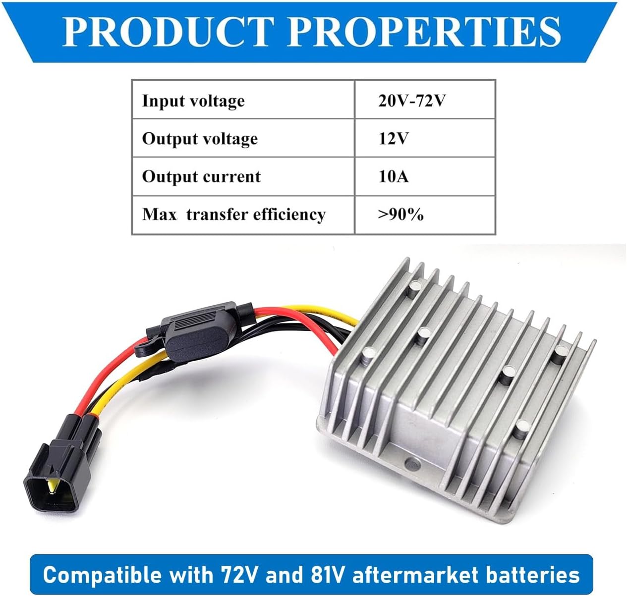 This is a 12V 10A DC voltage converter wired for Surron light bee. Plug and Play Connection! Works with stock 60V and aftermarket 72V batteries. Upgrade your DC buck converter to the next level. Improves upon 3A stock converter with powerful 10A delivery. Sufficient for powering high current lights and 12V accessories. Smooth power delivery and high capacity. More reliable and powerful than OEM DC converter.