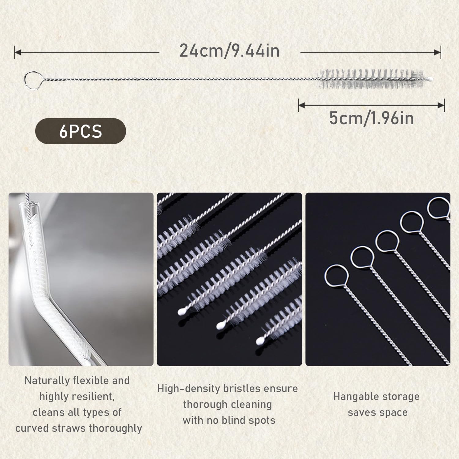 Product Specifications Brand: SYNTHORA Quantity: 6 Pieces Length: 9.43 Inches (24cm) Brush Bristle length: 0.39 Inches Material: 304 Food Grade Stainless Steel Handle + Nylon Bristles Model Size: 240 × 50 × 10 mm Designed for Thorough & Gentle Cleaning SYNTHORA straw cleaner brushes are designed to reach deep inside reusable straws and narrow tubes. The spiral nylon bristles make full contact with the inner wall, removing residue efficiently without scratching or damaging the surface. Flexible, Durable & Easy to Use The bendable stainless steel handle allows you to clean curved and angled straws with ease. Made from rust-resistant, BPA-free materials, these brushes are safe, durable, and dishwasher safe for hassle-free cleaning. Wide Application for Everyday Use Perfect for cleaning glass straws, stainless steel straws, silicone straws, smoothie straws, and other narrow pipes. Ideal for home kitchens, travel cups, reusable water bottles, and daily use by adults and families.