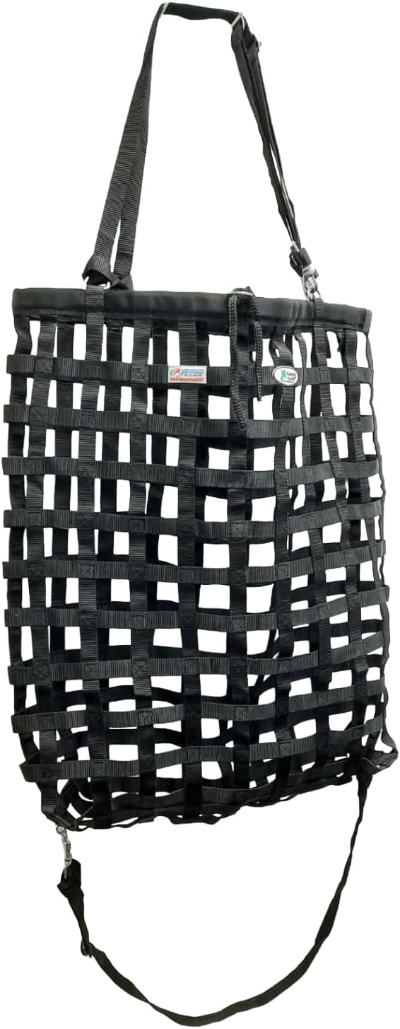 The Tahoe Patented Slow Feed Hay Bag is specially designed to help horses eat at a healthier pace while minimizing hay loss. This bag features durable 2"x2" square mesh openings on all four sides, giving your horse easy access to hay while slowing down consumption to improve digestion and reduce boredom. The easy-fill top ring saves time during feeding, and the super tough reinforced bottom withstands constant pulling and aggressive eaters. Ideal for use at home, in the trailer, or while traveling, this slow feeder encourages natural grazing behavior and helps keep stalls cleaner and more organized. A must-have for horse owners looking for convenience, durability, and improved feeding efficiency.