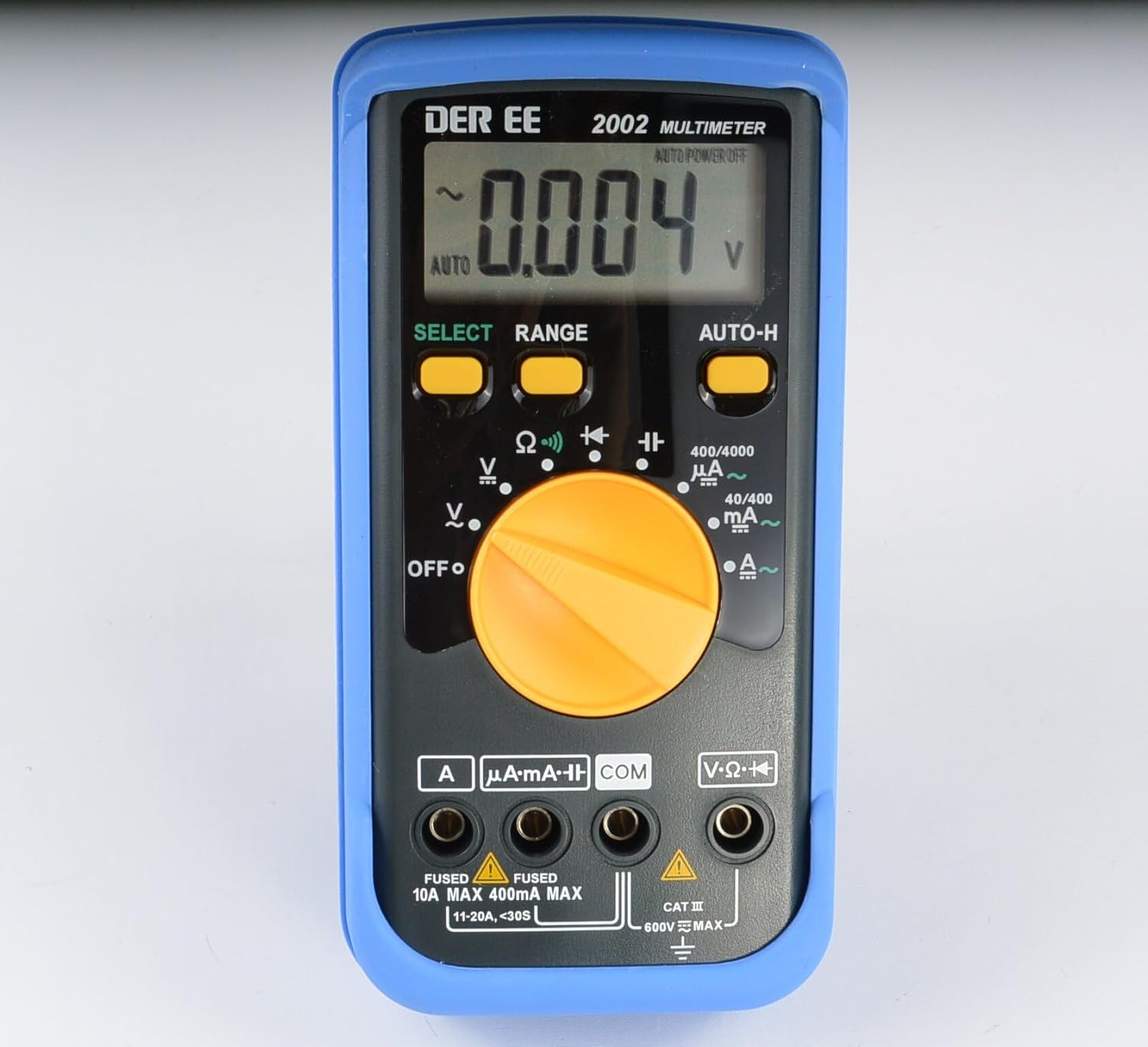 Taiwan Quality DER EE DE-2002 DE-2003 High Accuracy DMM Digital Multimeter DCV ACV DCA ACA Resistance Diode Buzzer Capacitance Frequency Multi tester volt meters and RMS multimeters Measurement Functions:DCV, ACV, DCA, ACA, DCμA, ACμA, DCmA, ACmA, Resistance, Diode, Buzzer, Capacitance LCD Display:3 3/4 Digits With 4300 Counts Sampling Rate:Approx. 2 times per second Range:Automatic & manual Overload:”OL” Display On LCD Low Battery: Display on LCD Auto Power Off:In 20 Minutes Approx. Battery:AAA 1.5V x2 EMC standard:EN 55011:1998 Group 1 Class B EN 61326-1; 1997+A1; 1998 Safety standard:IEC 61010-1 (2001) CAT.III 600V Auto Hold Auto Power Off Selection Auto Range & Manual Range Max. 20A (for 30 sec.) Zero Set For Capacitance Measurement Big Current Under Protection High Accuracy