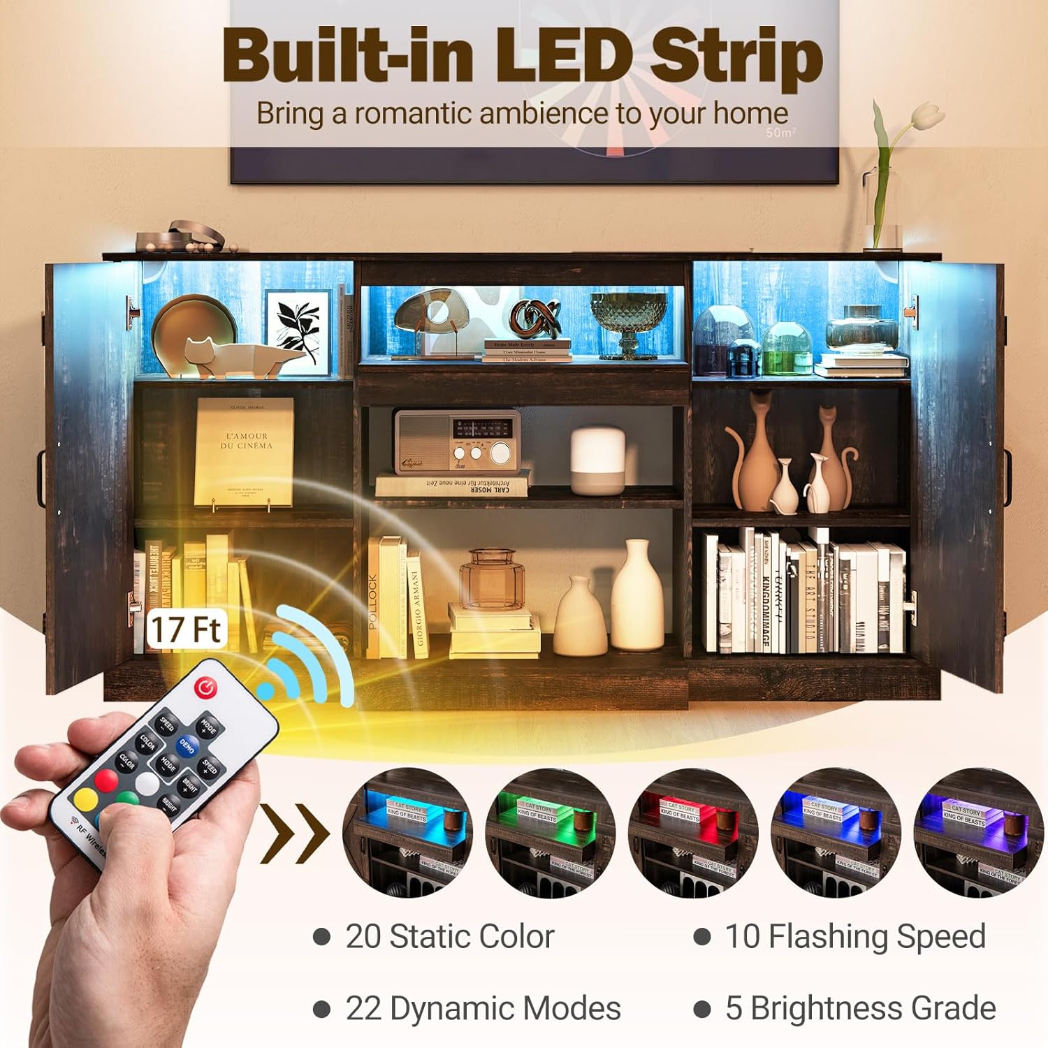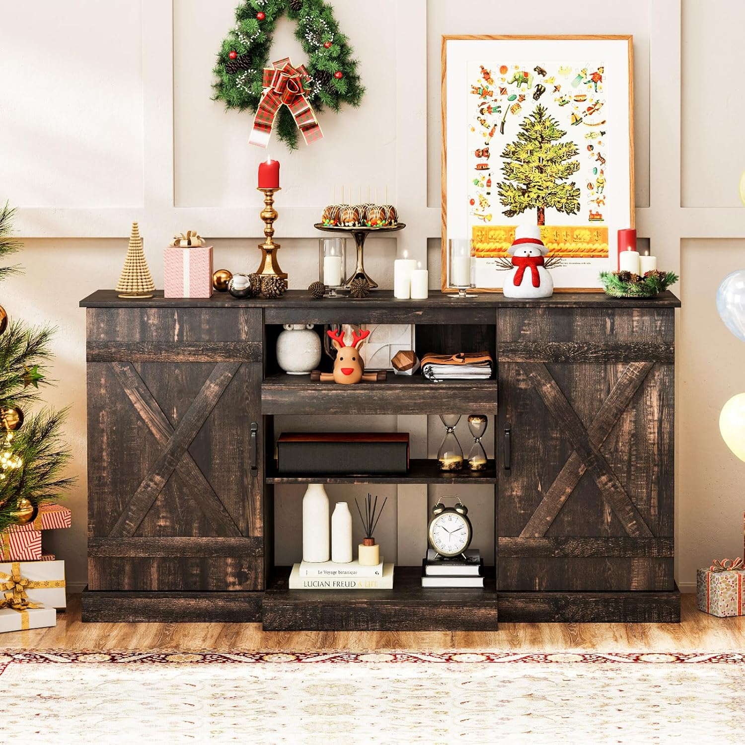 DescriptionEnhance the warmth and elegance of your living space with this functional rustic TV cabinet with farmhouse doors. The exquisite wood grain finish and built-in LED lights create a cozy and inviting ambiance. This versatile TV stand can hold televisions up to 65". You can enjoy ample storage with 2 cabinets featuring 3 adjustable shelves each, and the central fireplace area can transform into open shelves for versatility. User-friendly details showcase better workmanship, such as the metal hinges make it easy to access interior items. Upgrade your entertainment experience with this multifunctional and sturdy TV cabinet!FeatureElegant wood grain design brings a elegant touch to your homeWide tabletop is suitable for TVs Up to 65” (Includes 43”, 55”, 65”) Rustic TV stand with wood grain finish and LED lights2 cabinets with adjustable shelves and central fireplace areaBuilt-in LED with 20 static color and 22 dynamic modesSturdy construction with high-quality boards and stable baseVersatile cabinet suitable for living room, bedroom or studySpecificationColor: Dark Rustic OakMaterial: MDF, Engineered WoodOverall Dimensions: 59” x 18” x 32” (L x W x H) Size of Countertop: 59” x 14” (L x W) Size of Middle Upper Compartment: 23” x 18” x 7” (L x W x H) Size of Middle Lower Compartment: 23” x 18” x 18” (L x W x H) Inner Size of Each Side Cabinet: 16.5” x 12” x 27.5” (L x W x H) Adjustable Spacing of The Adjustable Shelves: 2.5” Remote Control Distance: 16.4 ftLoad Capacity of Countertop: 200 lbsLoad Capacity of Each Shelf: 33 lbsNet Weight: 101 lbsPackage Includes: 1 x TV Stand1 x Remote Control1 x User Guide