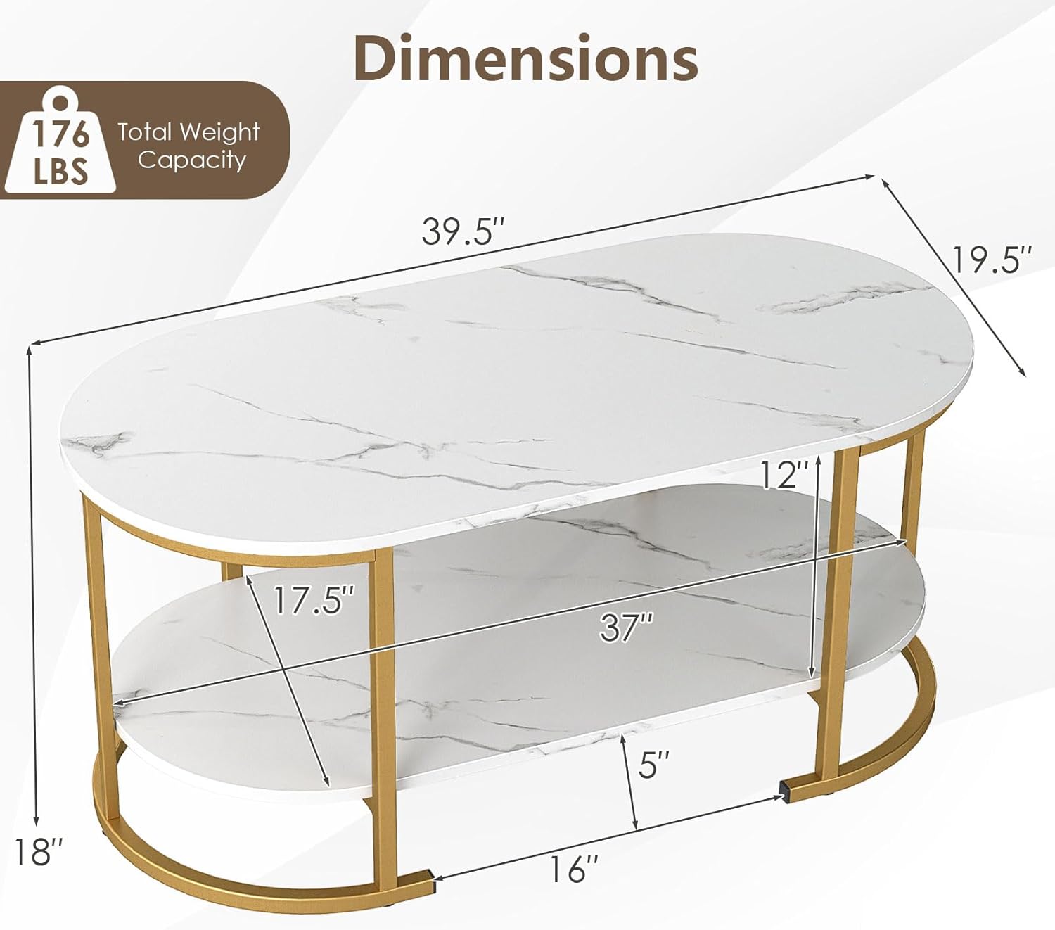 DescriptionUpgrade your living room with this modern faux marble coffee table! The combination of white faux marble tabletop and gold metal tube frame gives this oval coffee table a sophisticated and elegant look, which can match all styles of living rooms, reception rooms and more. What's more, this 2-tier coffee table features a wide tabletop and an open storage shelf underneath, that can hold a lot of daily essentials. Made of thick board and sturdy metal frame, the coffee table is stable. Additionally, the adjustable foot pads not only enhance stability but also protect your floors from scratches.FeatureFaux marble tabletop creates a visually striking appearanceCan be used as coffee tables, cocktail tables, tea tables, etc2-tier design offers large storage and display spaceU-shaped thickened metal frame ensures high sturdinessMetal tube with golden finish adds fashion and eleganceAdjustable foot pads adapt to uneven groundsSmooth and oval design for safer use Easy to assemble and wipe clean SpecificationColor: White & GoldMaterial: MDF, MetalOverall Dimensions: 39.5" x 19.5" x 18"/100 x 50 x 45 cm (L x W x H) Height between Shelf: 12.5"Height from the Ground: 4"Total Weight Capacity: 176 lbs/80 kgWeight Capacity of Tabletop: 88 lbs/40 kgWeight Capacity of Shelf: 88 lbs/40 kgNet Weight: 25.5 lbsPackage Includes:1 x Coffee Table1 x Instruction